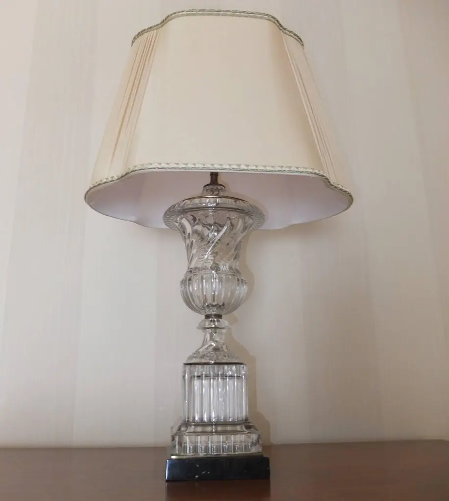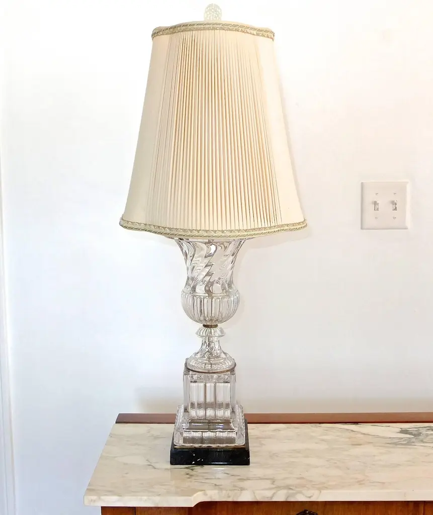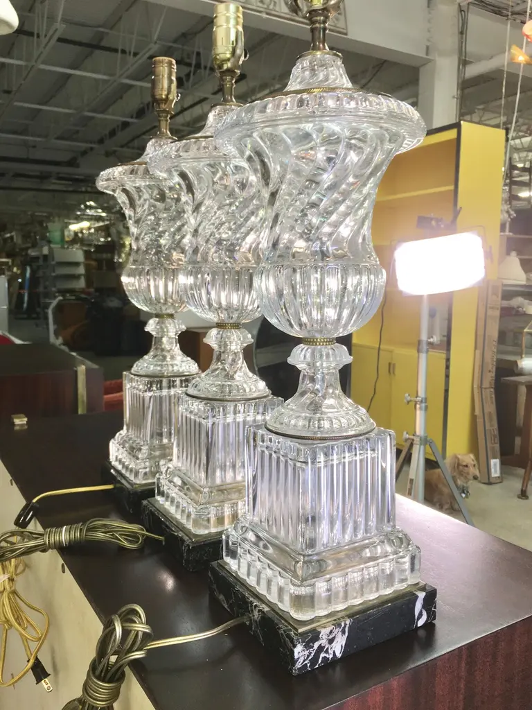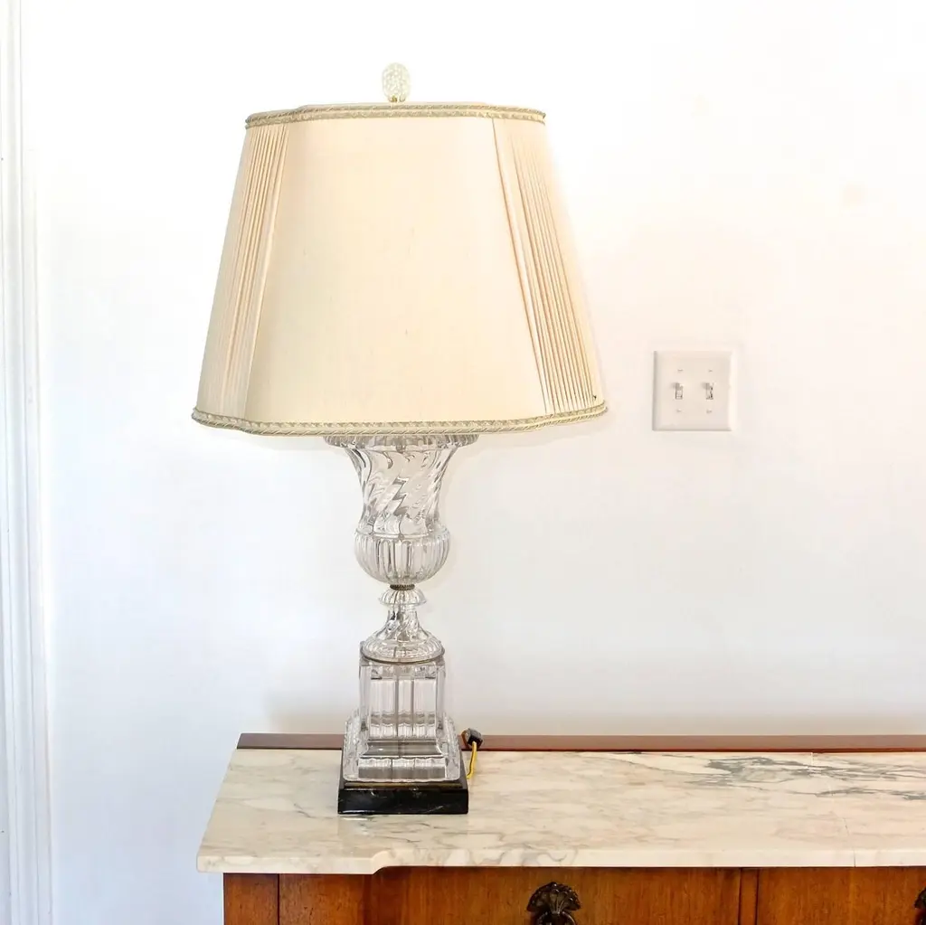 We have a total of three of these Baccarat style urn or vase form crystal lamps on square black veined marble bases with subtle bronze embellishments, by Paul Hanson Lighting Co. 20 inches high from table to top of glass urn below socket. Diameter 7.5 inches at widest flared rim of vase. Base 6 inches square. In the photos with the display shade the height is 35 inches from table to finial. Price shown is per lamp.Documented: Interiors magazine 1952-06: Vol 111 Issue 11