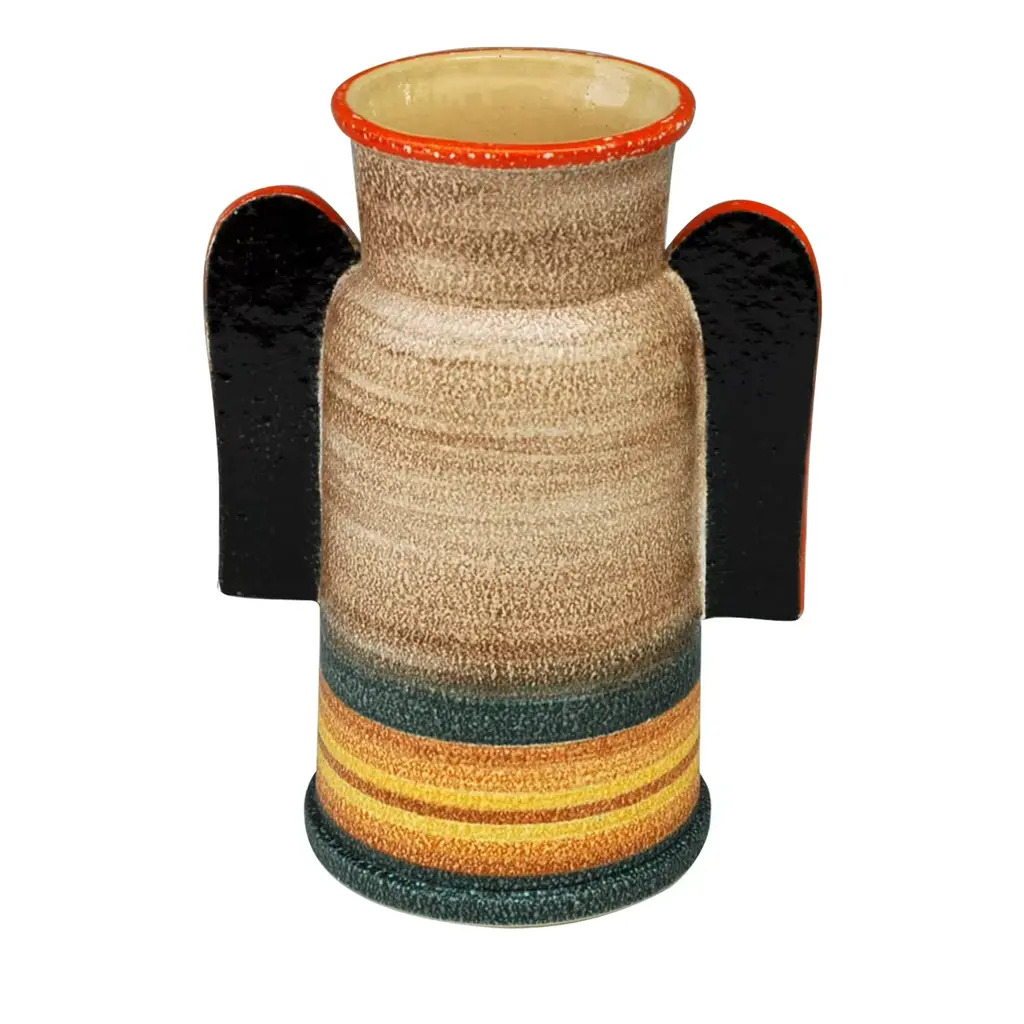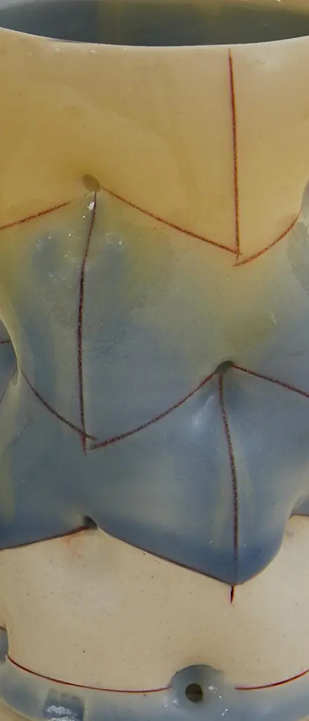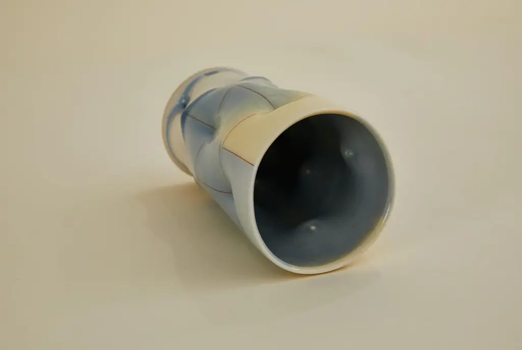 These are one-of-a-kind mixed ceramic vessels of unknown origin. They could be used as a drinking vessel, flower vase, or the perfect cup for your favorite writing utensils. Curvy in form, these pieces have unique concave indentations throughout that push into the hollow vessel.The glaze is a beautiful mix of periwinkle, pale yellow, ivory, and scarlet.Contemporary Biomorphic Ceramic Vessel