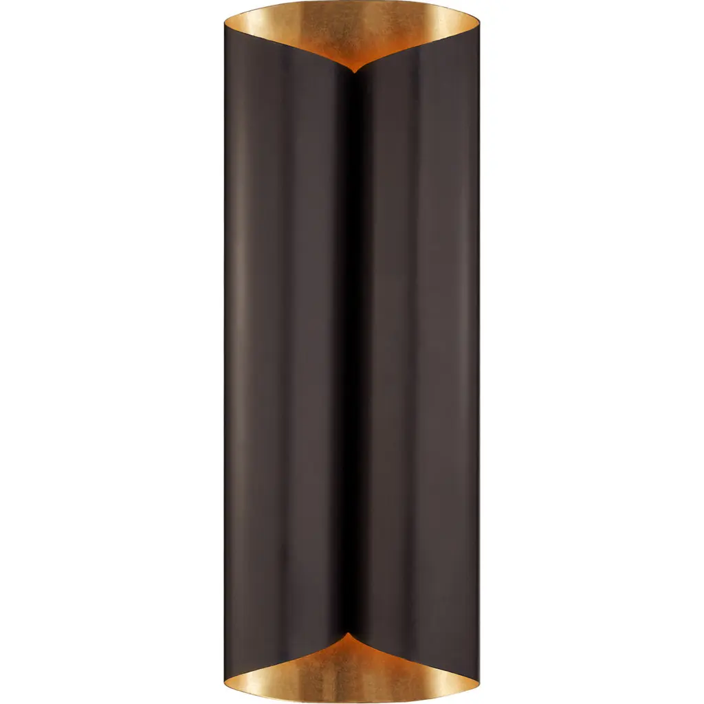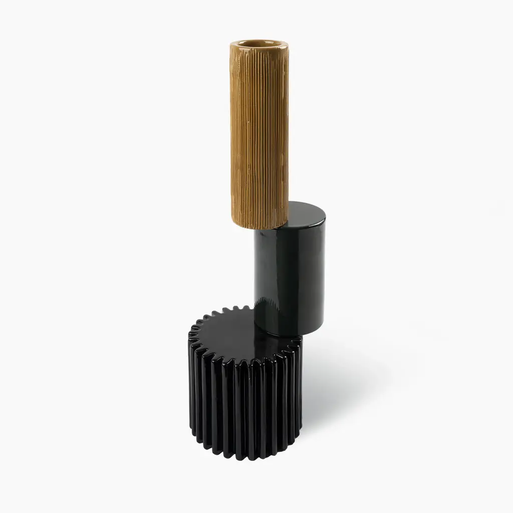 Imbued with a clear sculptural flair, this ceramic vase - presented at the 2019 Milan Design Week - offers an asymmetrical silhouette composed of different-sized, piled cylindrical elements, respectively painted in ocher, forest-green, and black. The bottom, black cylinder is enlivened by a grooved outer surface lending this design a sober yet intriguing textural twist.