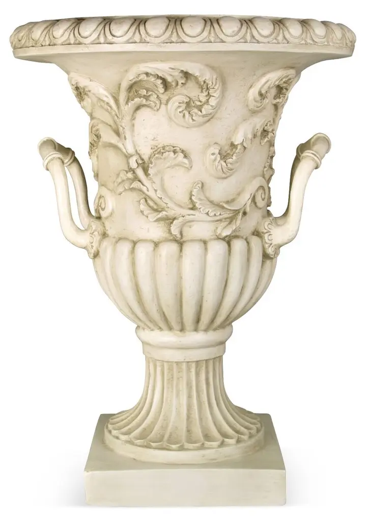This gently weathered urn is a stately piece whether placed outdoors or in. Crafted of Fiber Stone, in which sand and pebbles are cast into fiberglass to create the appearance of aged stone, it weighs much less than stone and is more durable than concrete. Made in the USA.