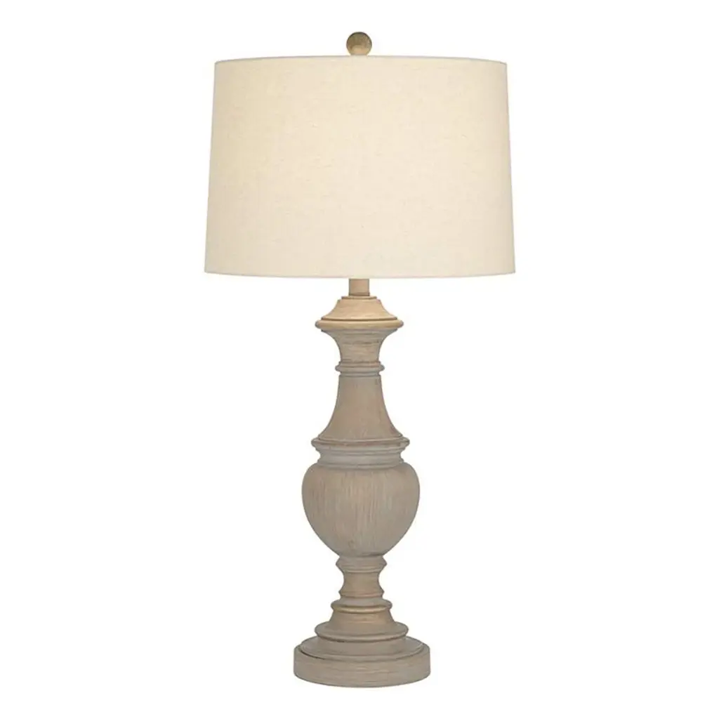 30" high overall. Shade is 14" across the top x 15" across the bottom x 10" high. Uses one maximum 150 watt standard-medium base light bulb (not included). On-off socket switch. Traditional lamp with an urn lamp profile. Gray wash finish base. Cast resin construction. White linen tapered drum shade. 8-foot long clear-silver cord. Get both style and convenience in one with this USB table lamp design., the designer lamp base has a traditional urn lamp profile with a turned-look in a gray wash finish. The built-in USB charge port in the base allows you to keep your phones and other devices ready to use. Up top is a white linen tapered drum shade.
