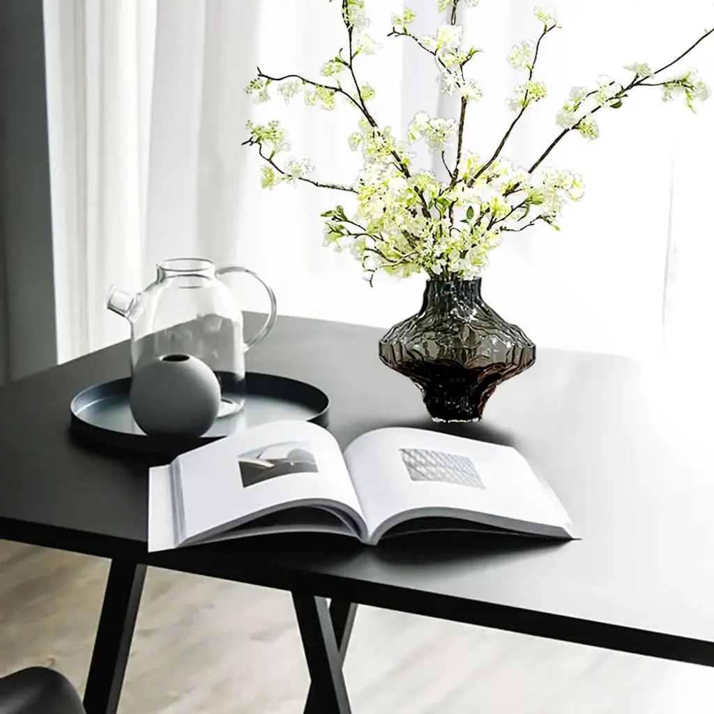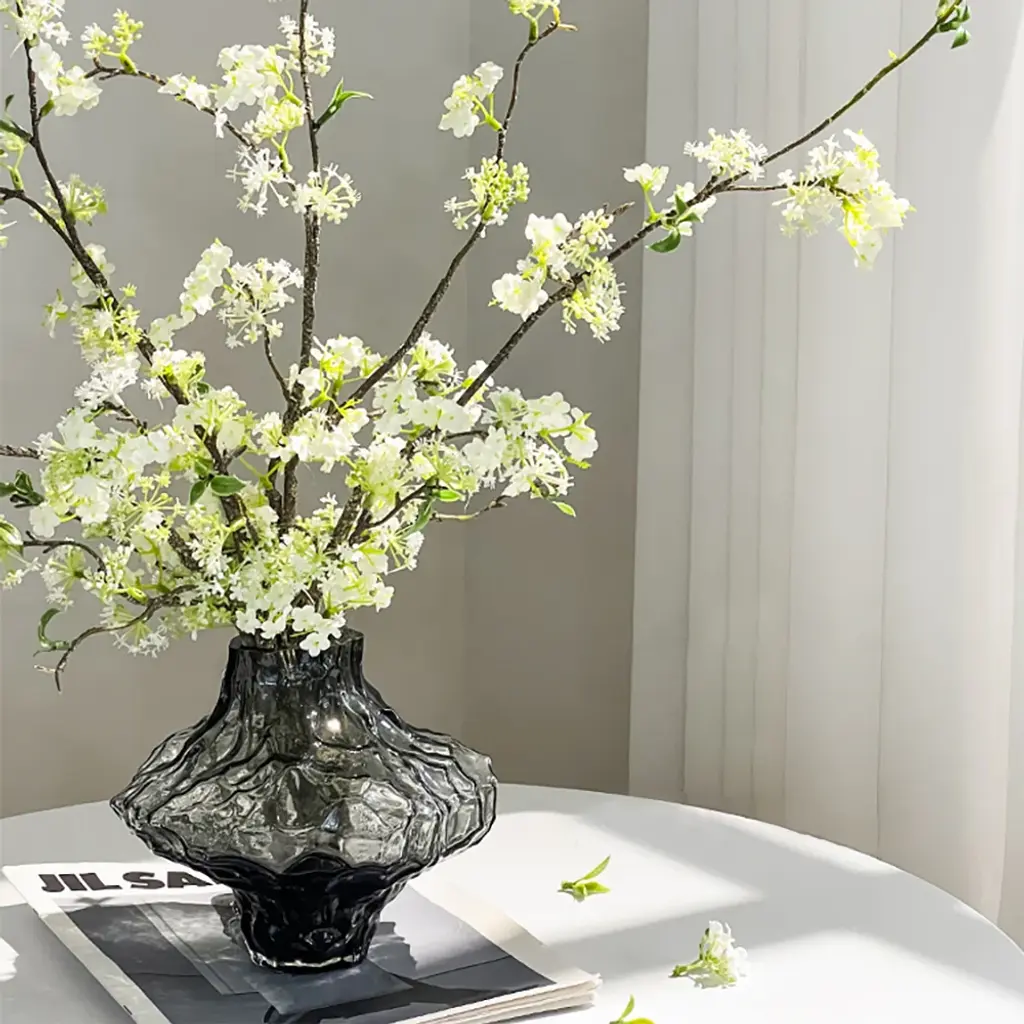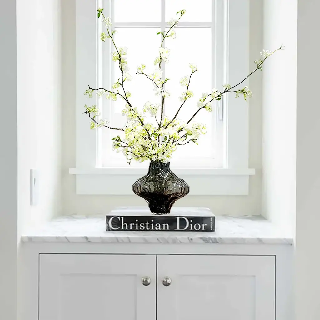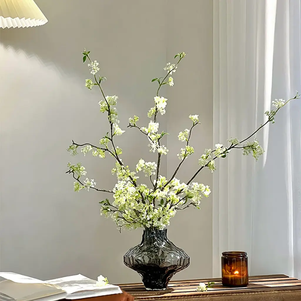 The artificial cherry blossoms are beautiful and bright, and the white and green colors can be easily integrated into any space. The realistic petals and bendable branches are made of plastic that are comfortable to the touch. You can adjust the length of the flower branches at will. The smoky gray glass vase enhances the texture of the entire product. (This product needs to compress and transport artificial flowers. After unpacking, you can refer to the picture effect to organize and restore. The height and width of the product may vary slightly due to the blooming conditions of the artificial flowers.The color may be slightly different due to different monitor models or lighting conditions.)