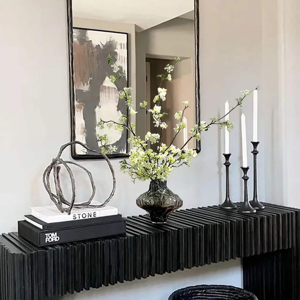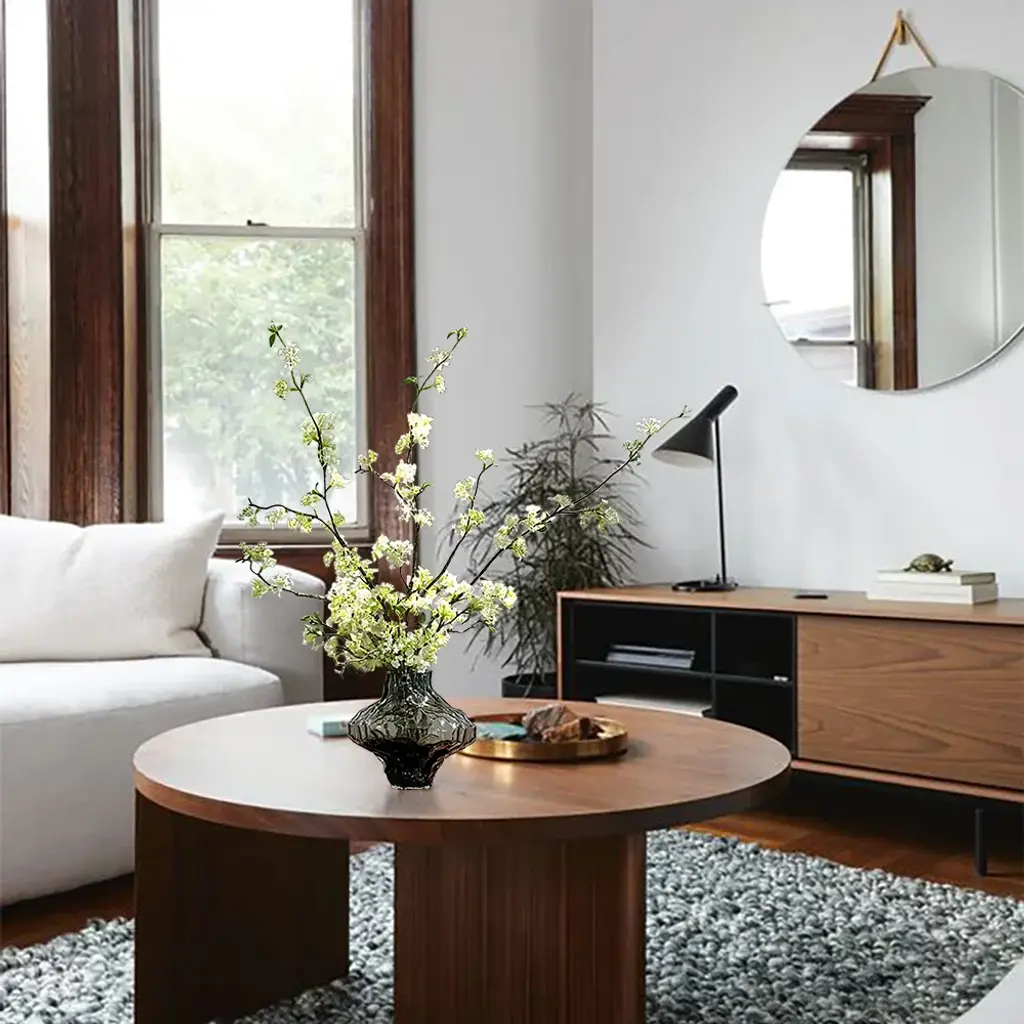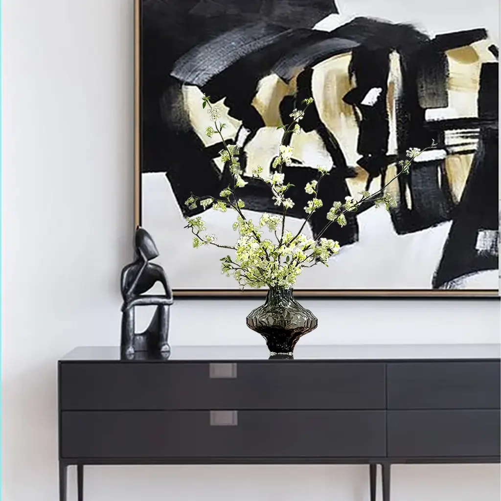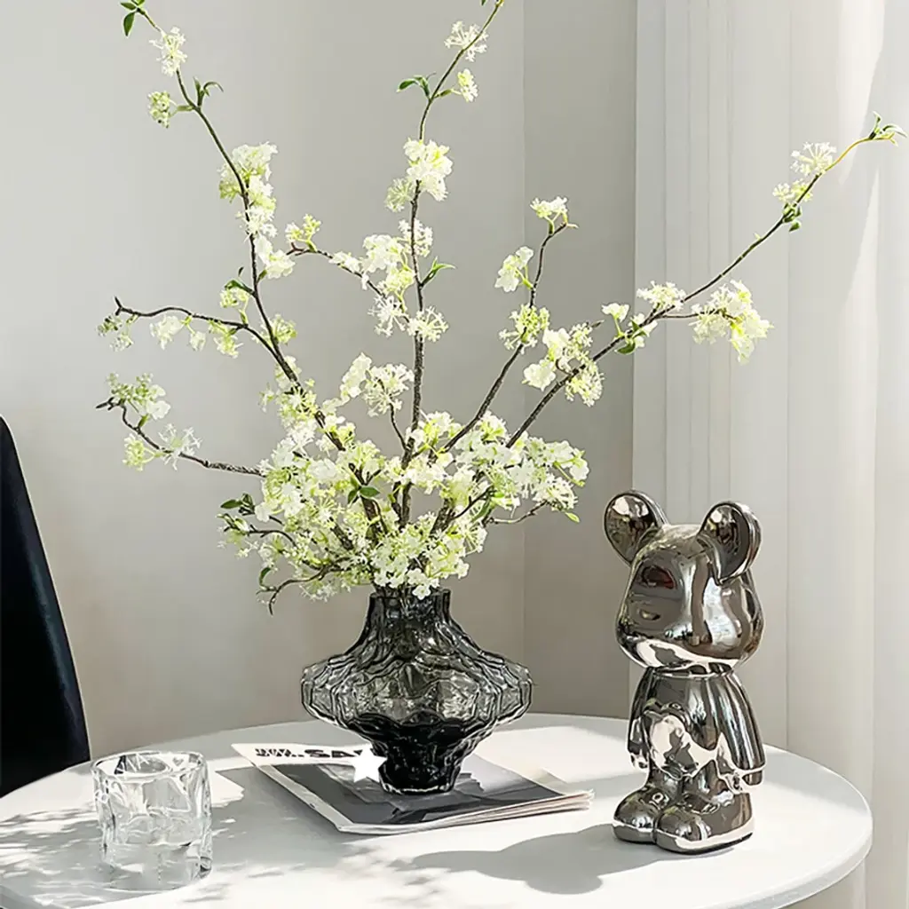 The artificial cherry blossoms are beautiful and bright, and the white and green colors can be easily integrated into any space. The realistic petals and bendable branches are made of plastic that are comfortable to the touch. You can adjust the length of the flower branches at will. The smoky gray glass vase enhances the texture of the entire product. (This product needs to compress and transport artificial flowers. After unpacking, you can refer to the picture effect to organize and restore. The height and width of the product may vary slightly due to the blooming conditions of the artificial flowers.The color may be slightly different due to different monitor models or lighting conditions.)