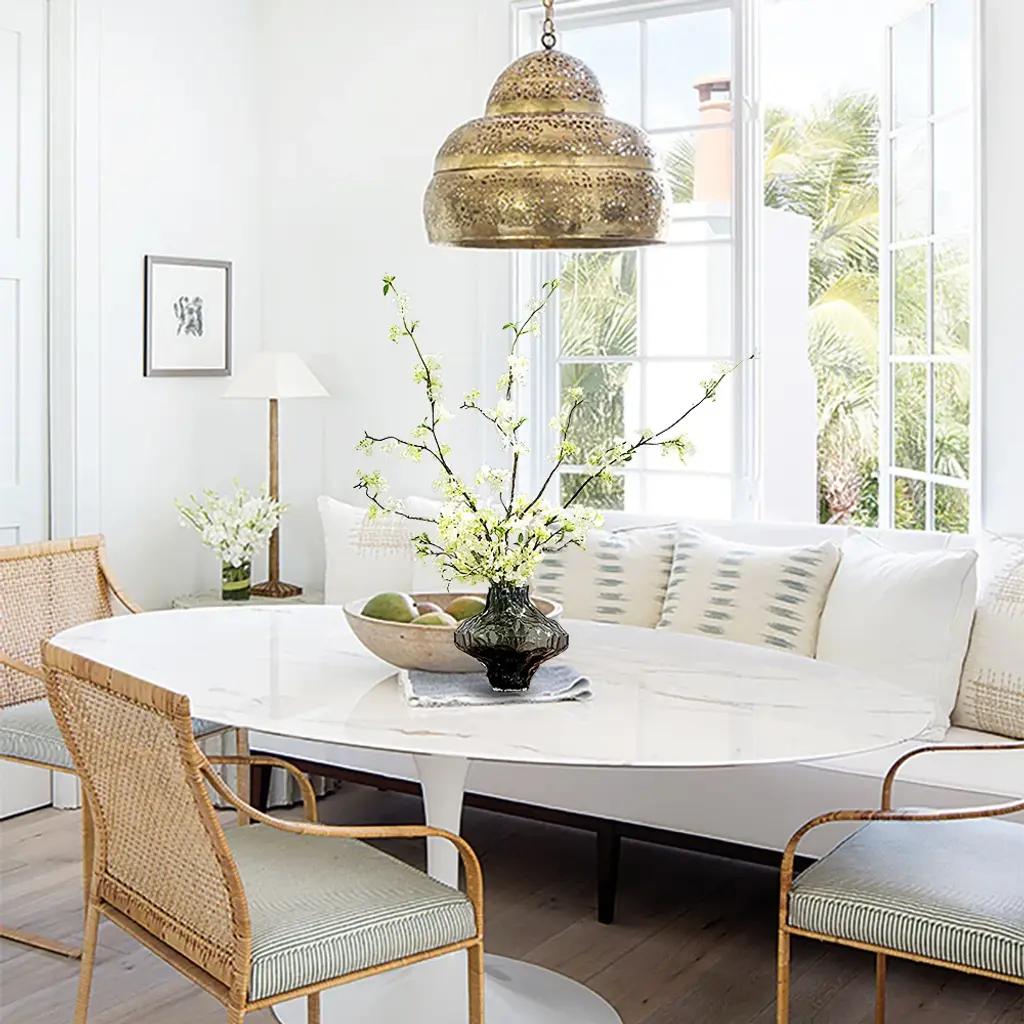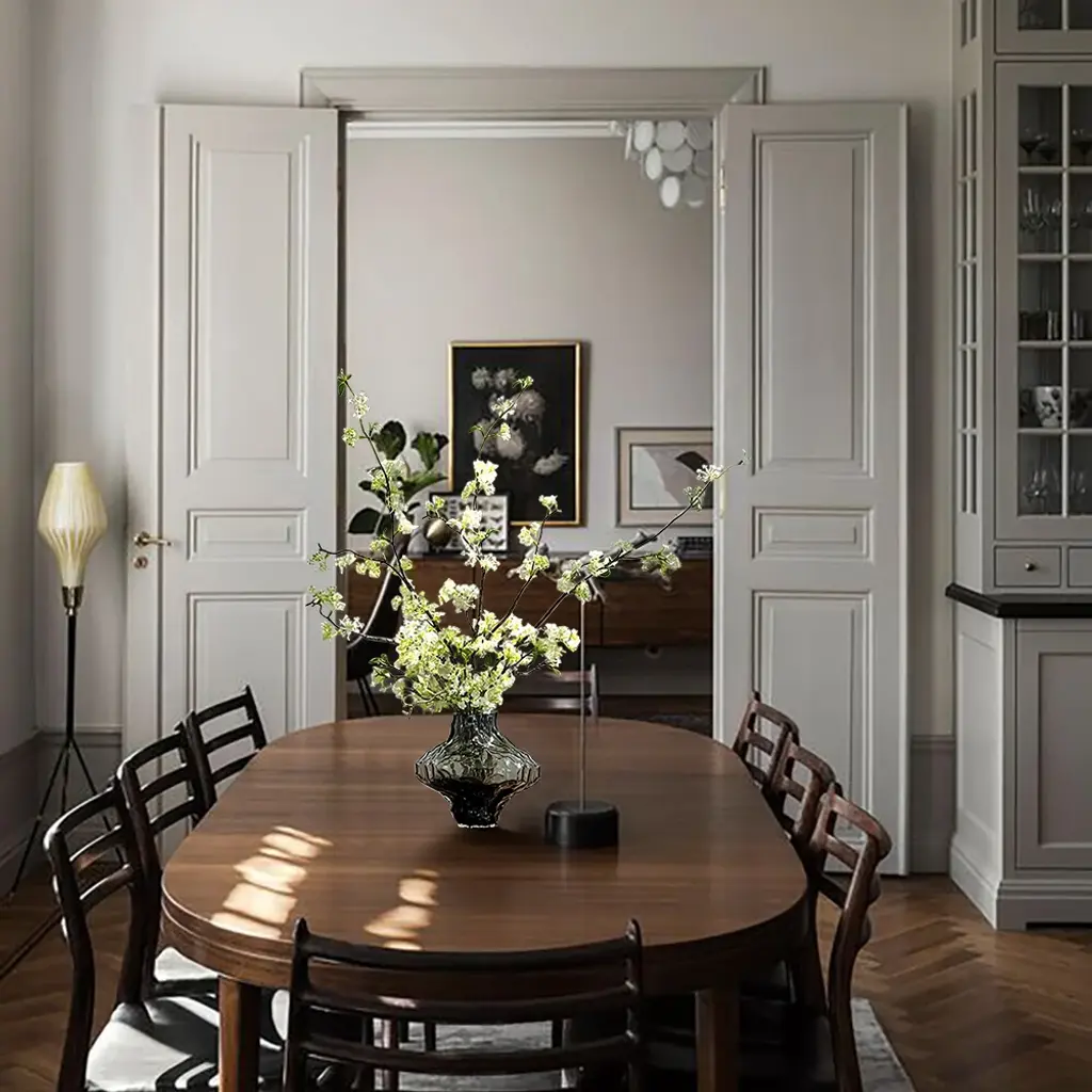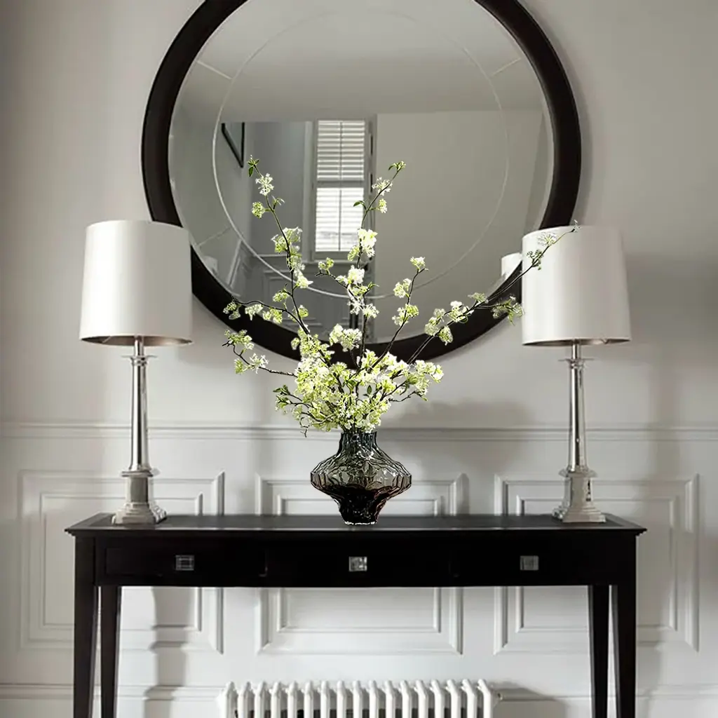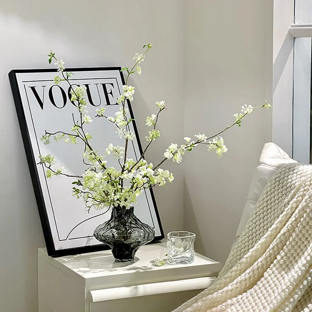 The artificial cherry blossoms are beautiful and bright, and the white and green colors can be easily integrated into any space. The realistic petals and bendable branches are made of plastic that are comfortable to the touch. You can adjust the length of the flower branches at will. The smoky gray glass vase enhances the texture of the entire product. (This product needs to compress and transport artificial flowers. After unpacking, you can refer to the picture effect to organize and restore. The height and width of the product may vary slightly due to the blooming conditions of the artificial flowers.The color may be slightly different due to different monitor models or lighting conditions.)
