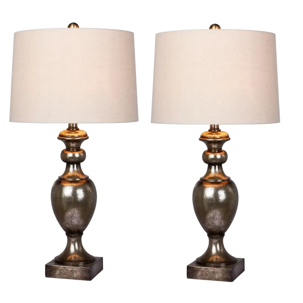 Two luxury lamps without the luxury price! 6252GL-2PK 28" Textured Urn Resin Table Lamp Set in Antique Gold Leaf is sure to instantly charm. Attention to detail can be found in the striking look and Square base design that will add a subtle Classic Flare to your favorite space. The Antique Gold finish is among the most desired in homes today! Lamp set includes two designer shades made in a décor friendly hue of Oatmeal. Each light comes complete with an easy to use 3-Way switch. This item takes 2 bulbs, each with a maximum wattage of 100 (Not Included.) Lamps are UL and CSA Listed. Showcase your discerning tastes brilliantly with this set. The stylized, Urn with Square Base look possesses its own presence while illuminating your exquisite decorating tastes. If you enjoy the graceful lines of Traditional designs, this is the lamp collection for you! Bring this set home! You will be glad you did!
