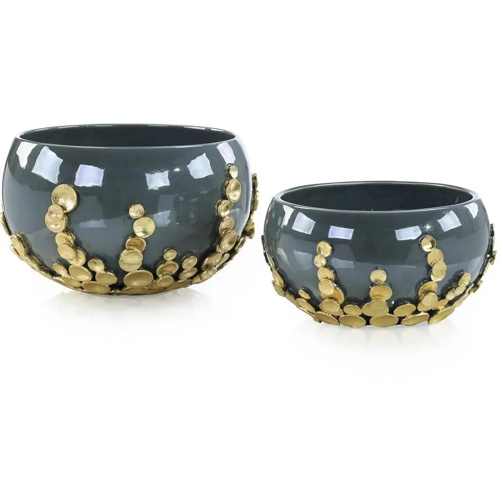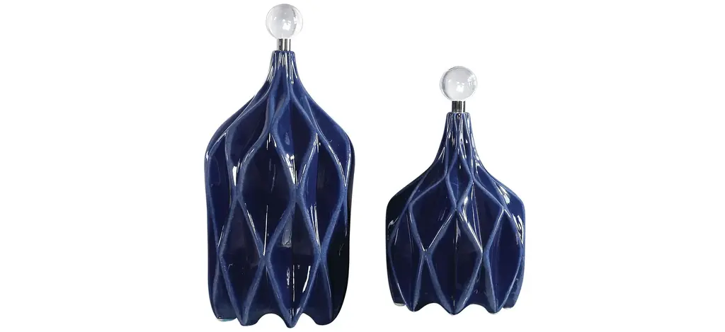 These decorative vases bring forth a gorgeous motif that elevates an interior space through the beauty of nature’s bounty. Crafted from glass with an enamel coating, both vases possess a deep, romantic shade of blue that is beautifully complemented by the rich, ornate tones of the aluminum stems in a Champagne finish. The Set of Two Blueberry Vases features a rich color palette that will greatly impact the atmosphere of any décor.