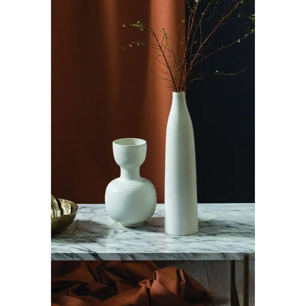 The silhouette of the common vase is anything but that. Its modern simplicity and smooth reactive glaze balance the drama of the shape.