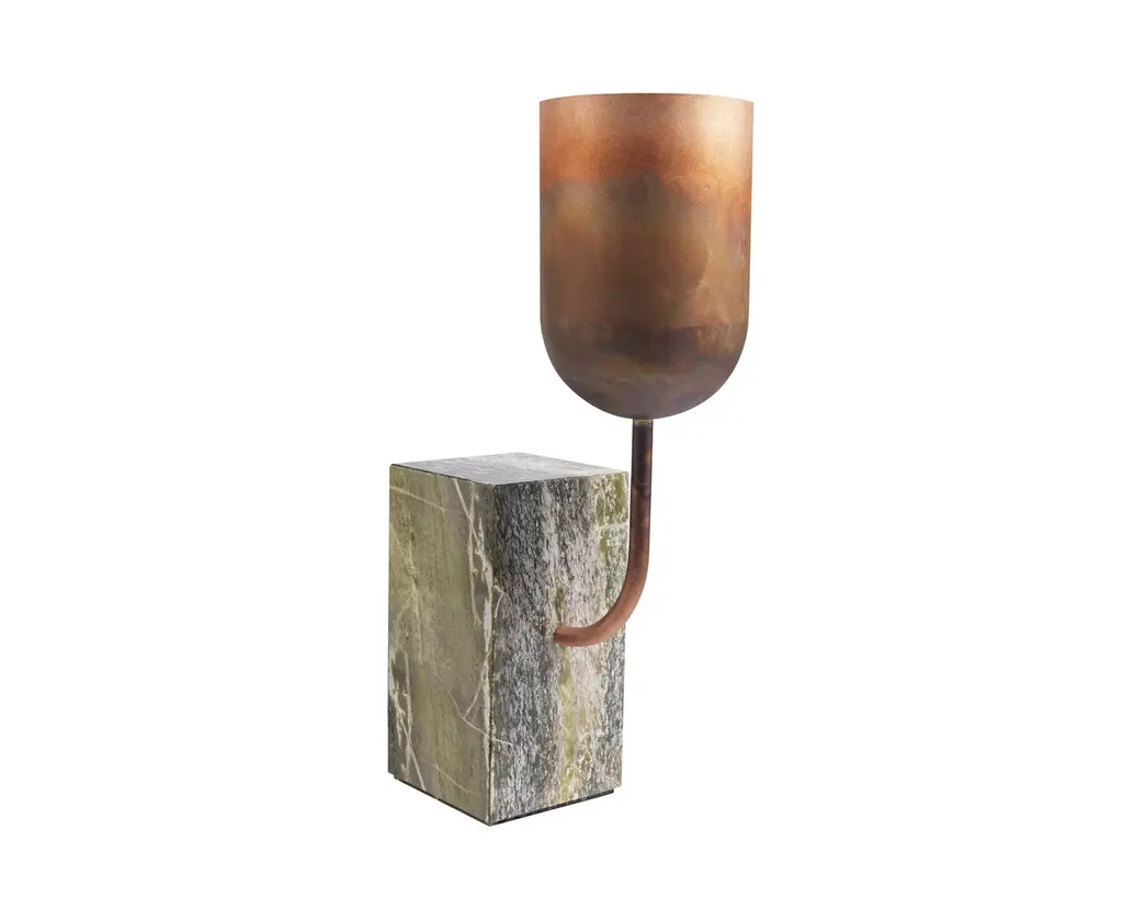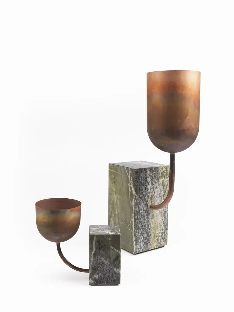 The stone, with its primordial strength and its material beauty, becomes a powerful base from which metal extensions grow organically. Going beyond the idea of a simple ornamental piece, Aboram is a sculpture open to a thousand interpretations, according to its users’ needs and to the environment in which it is inserted. Vase with base with polished Irish Green marble slabs. Goblet in natural copper.