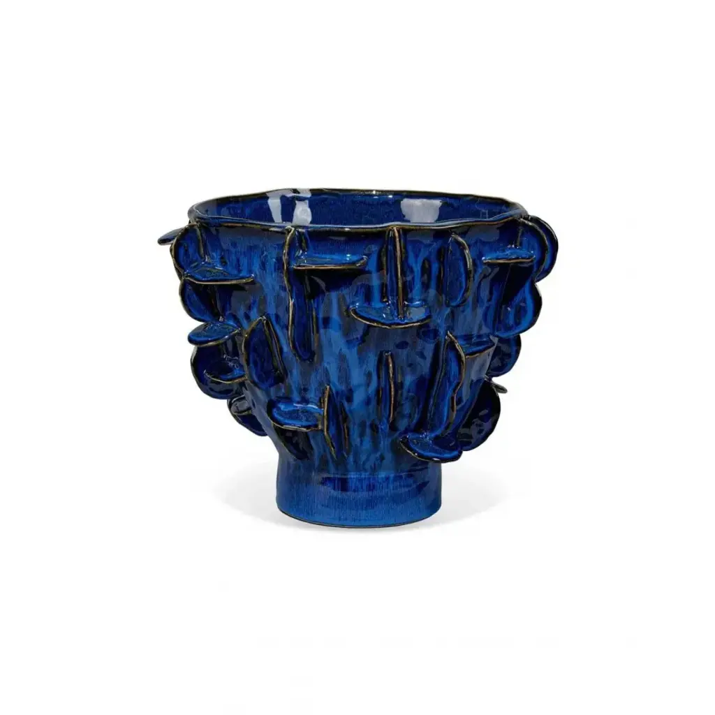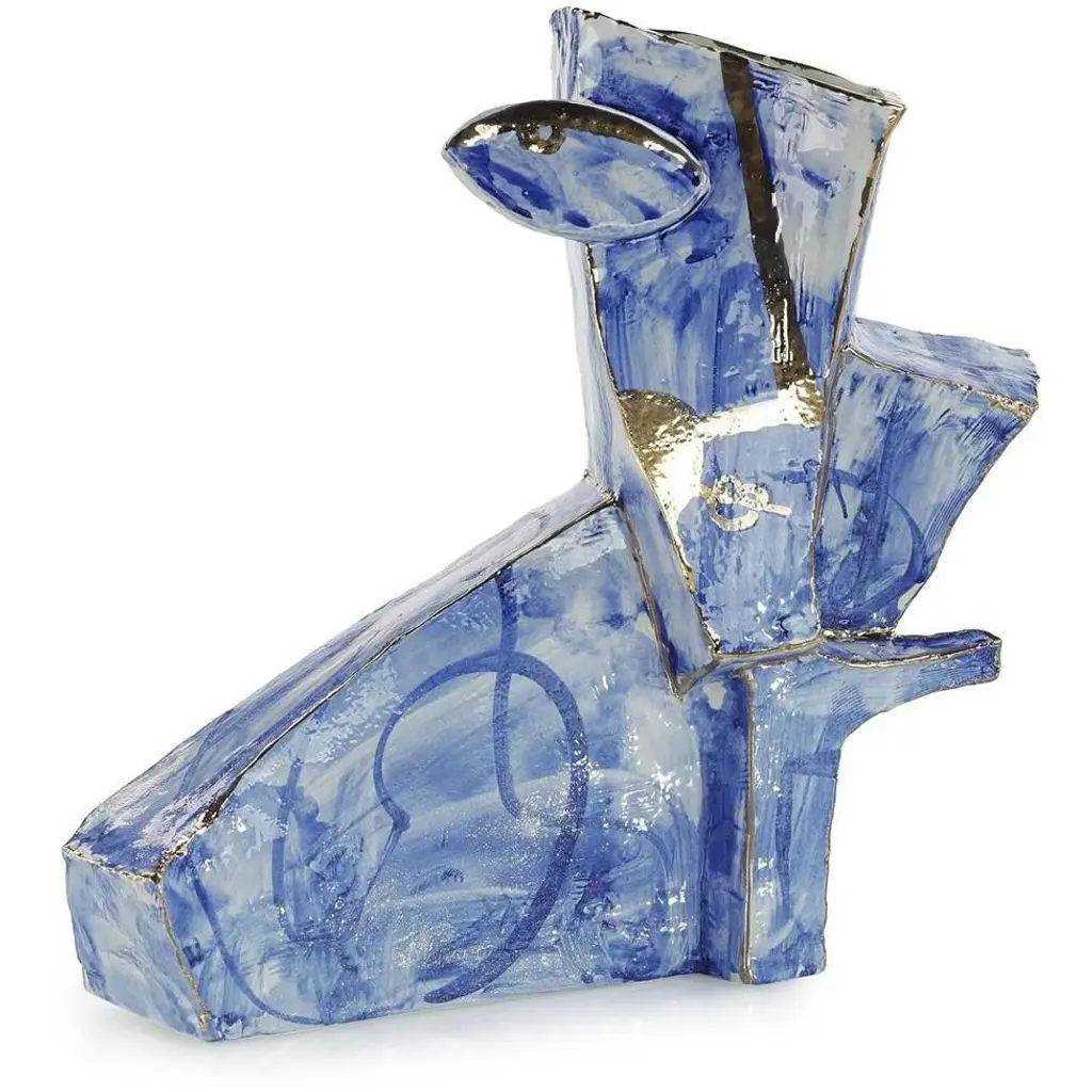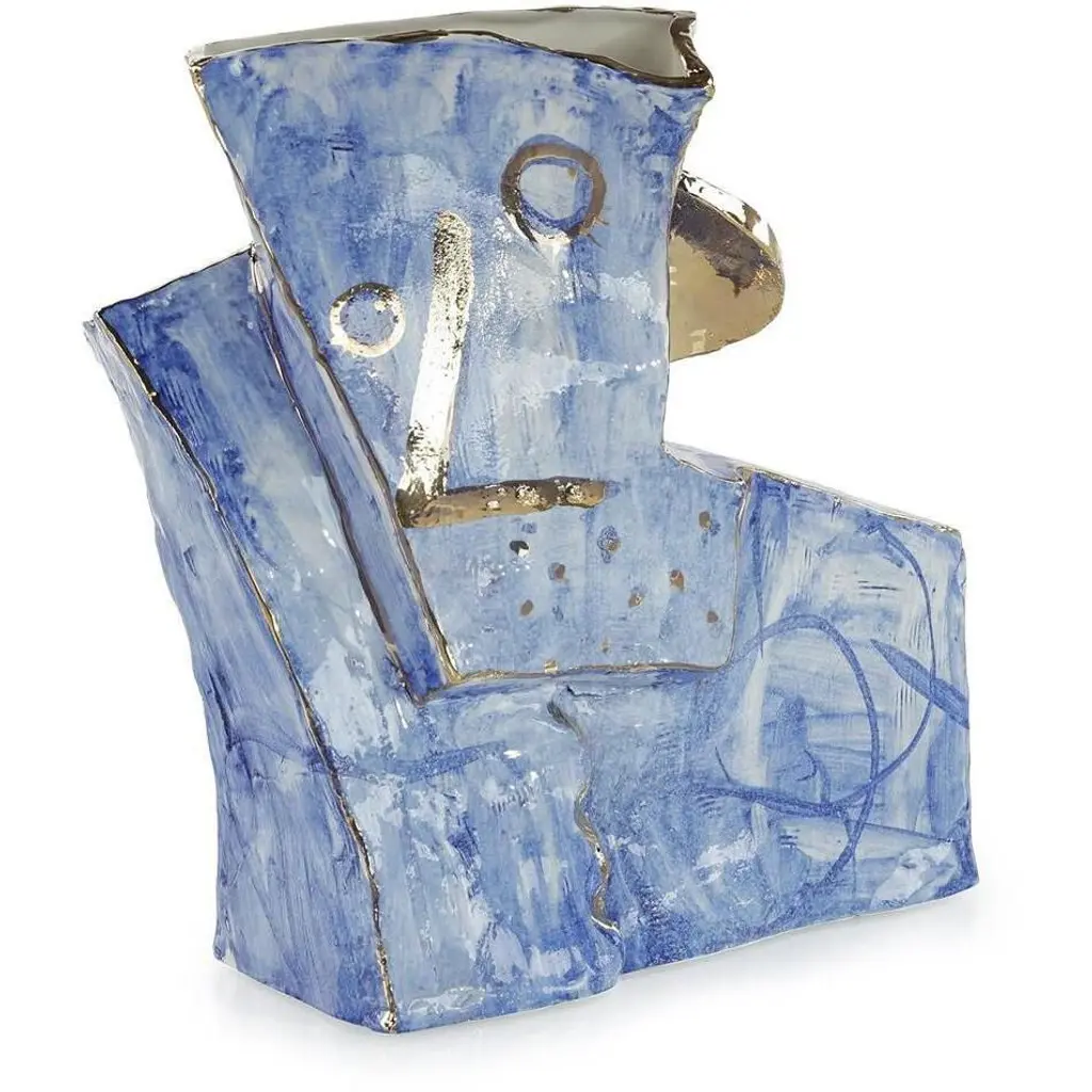 The Abstraction Vase showcases a wild, unpredictable shape that creates a stunning focal point within a space. Crafted from porcelain with a hand-applied glaze, the piece is a collection of sporadic shapes that communicate a sense of visual depth. This artistic vase elegantly blends blue and gold tones as they intermingle with the white porcelain background.