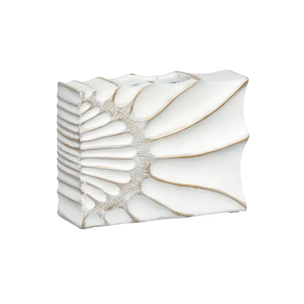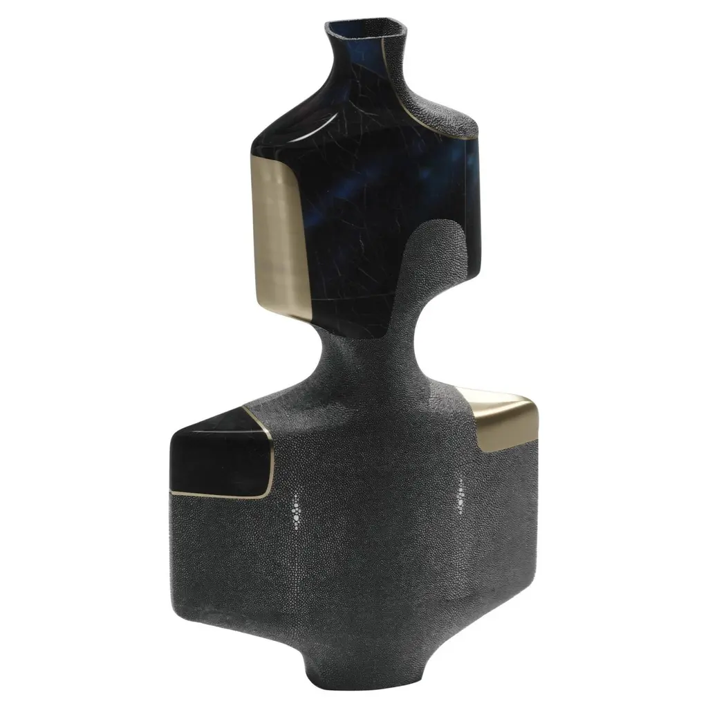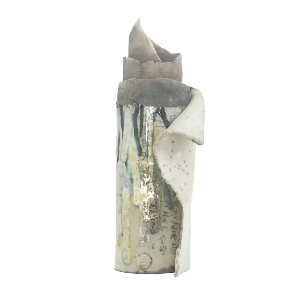 The Abstraction Vase showcases a wild, unpredictable shape that creates a stunning focal point within a space. Crafted from porcelain with a hand-applied glaze, the piece is a collection of sporadic shapes that communicate a sense of visual depth. This artistic vase elegantly blends blue and gold tones as they intermingle with the white porcelain background.