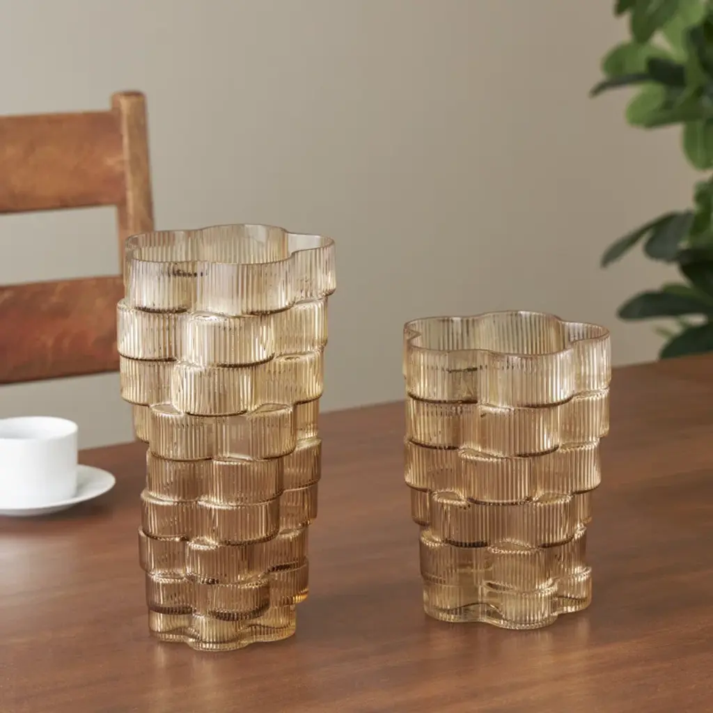 Fill this set of 2 clear glass vases with water and flowers for a romantic atmosphere in any room of your home. This colored vase comes as a set of 2. Modern style.