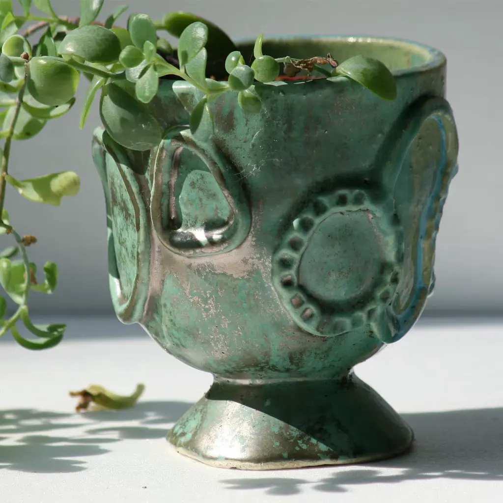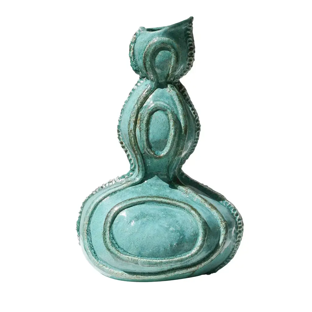 The Acini vase holder features an elegant shape enhanced by unique raised decorations. Crafted using mixed techniques, it displays a subtle blend of turquoise and green shades with a refined matte metallic finish. Each piece is crafted individually, resulting in slight variations due to its artisanal production process. Also available in different sizes and colors for seamless integration into any décor. Contact the Concierge for more details.
