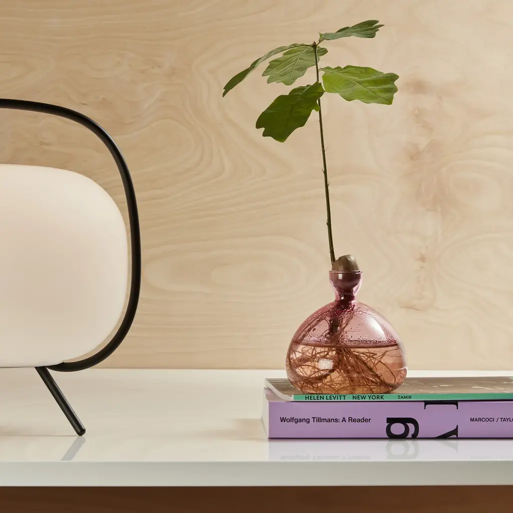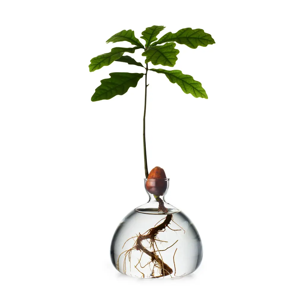 Best seller! Observe the beauty and form of an oakling’s leaves and roots as they sprout in this bulbous glass vase. Designers Ed Spurr and Amy Hall Browne of ILEX Studio drew their inspiration from Spurr’s stint at Matthew Marks Gallery in New York. Spurr organized the flower arrangements for a dinner held for artist Ellsworth Kelly after the opening reception of Kelly’s exhibition of beautiful and simple plant drawings. The artworks opened the eyes of the designers to observe the form of leaves and to contemplate nature in a new way. Hand wash only.   The MoMA Exclusive Color versions of the Acorn Vase are inspired by the colors of Kelly’s Colored Paper Image XXII (Blue Green Yellow Orange Red (1976–77), an artwork in MoMA’s collection. The Ilex Studio Acorn Vase is made in the UK and measures 3.9h x 3.9" diam.   The Cosmic Astra version of the Acorn Vase features iridescent glass.   The Acorn Vase allows you to enjoy this process simply: just fill it with water and place an acorn (not included) in the small chamber at the top, and watch it grow, day by day.
