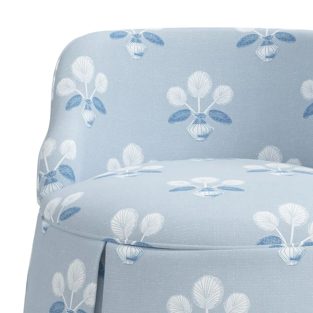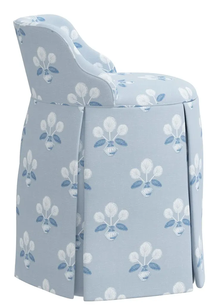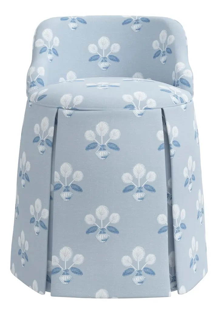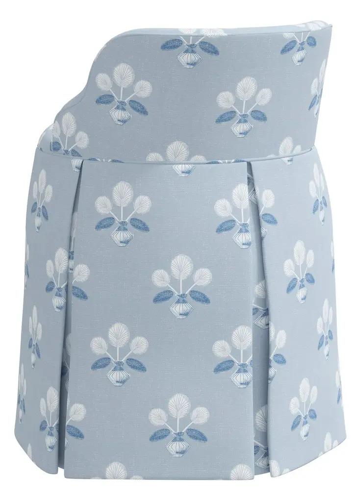 Exclusive to One Kings Lane: With its long skirt and ladylike silhouette, this vanity stool will bring a touch of feminine mystique to any space. The painterly print of flowers in vases adds to the charm. Handcrafted in the USA.