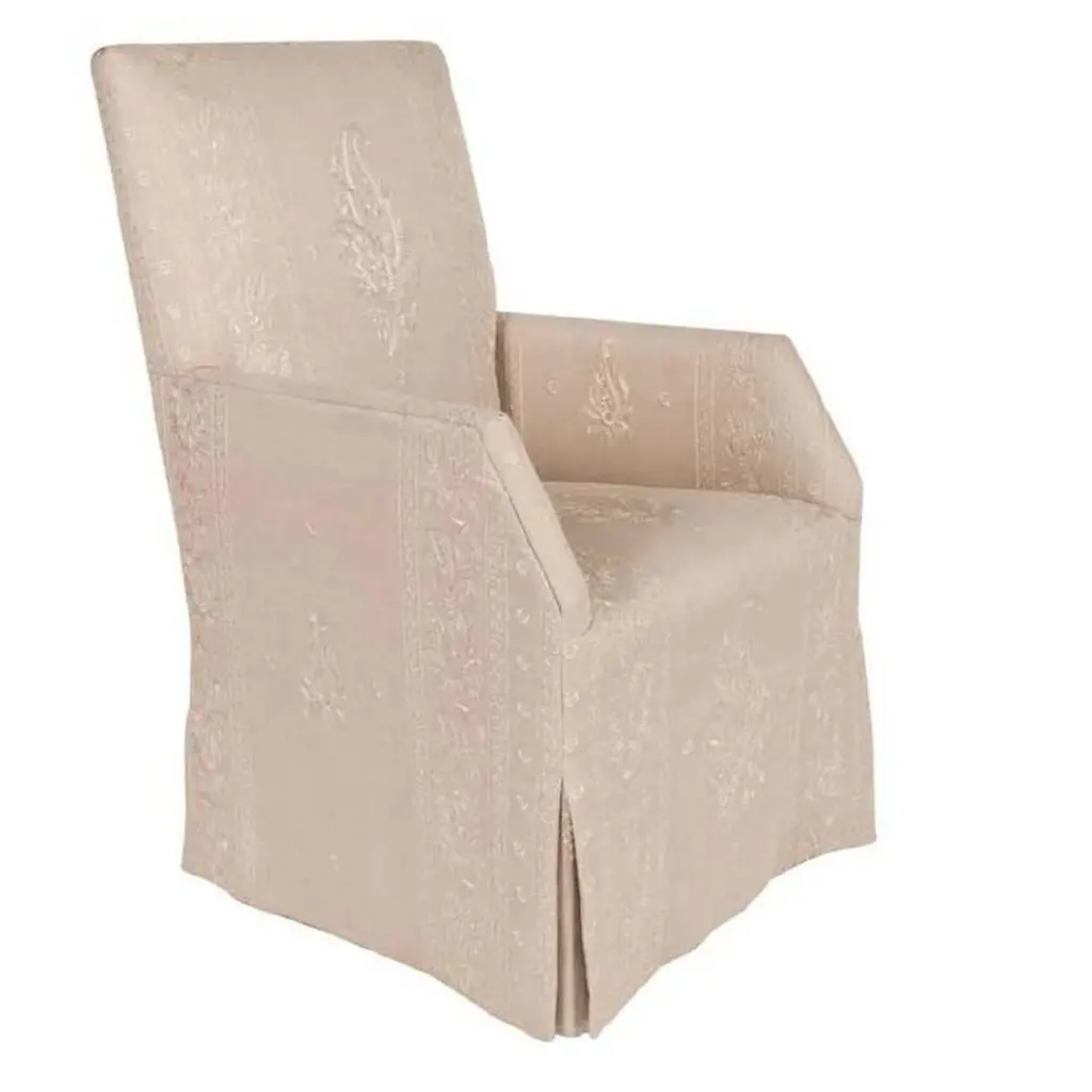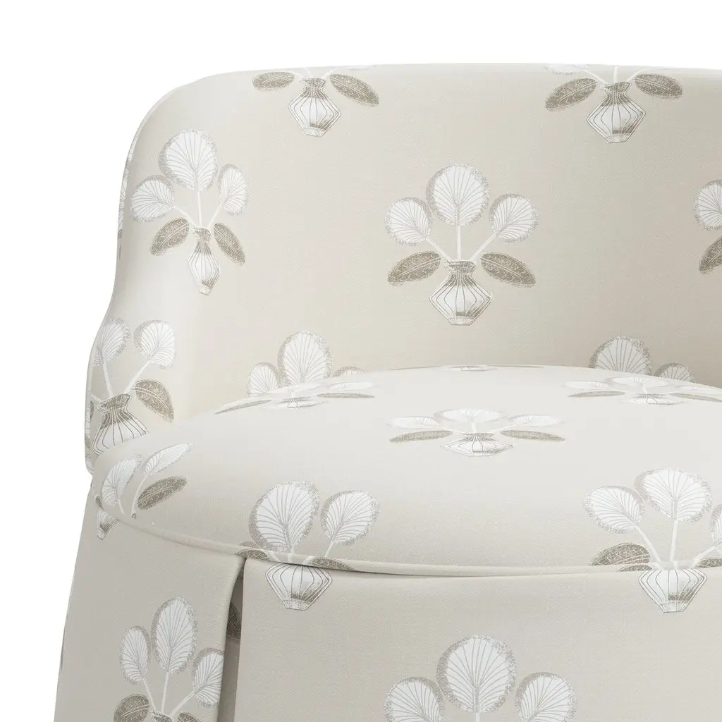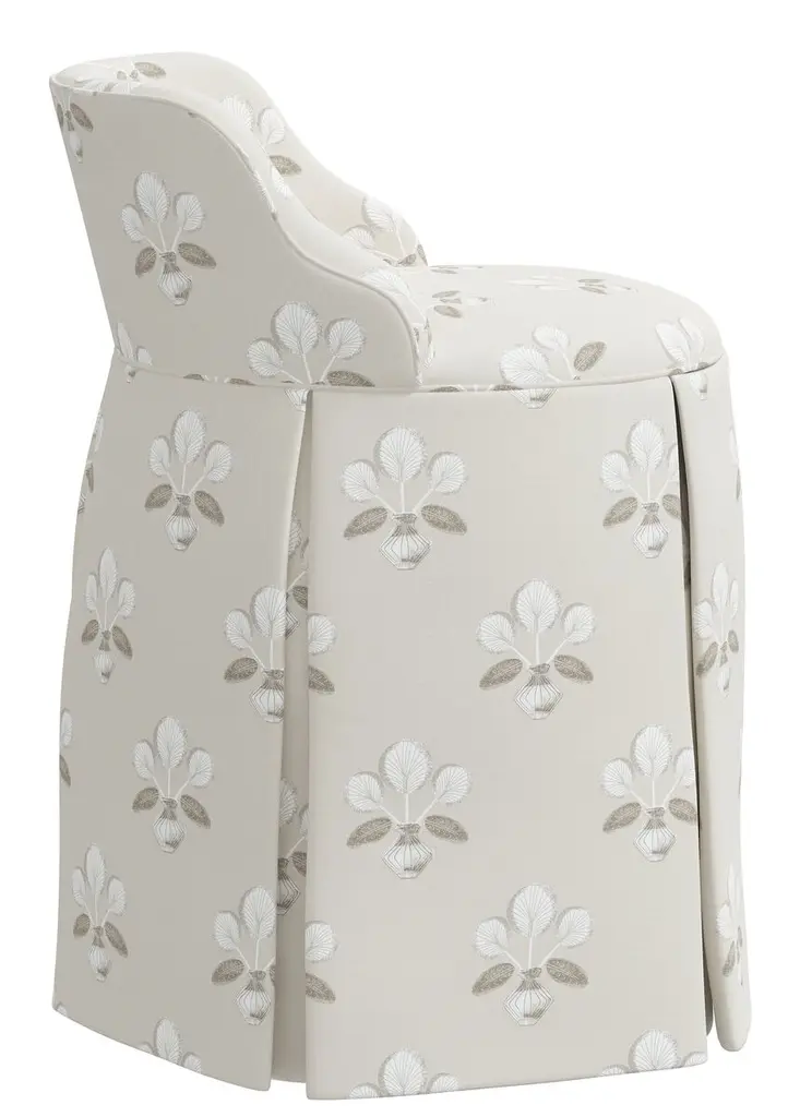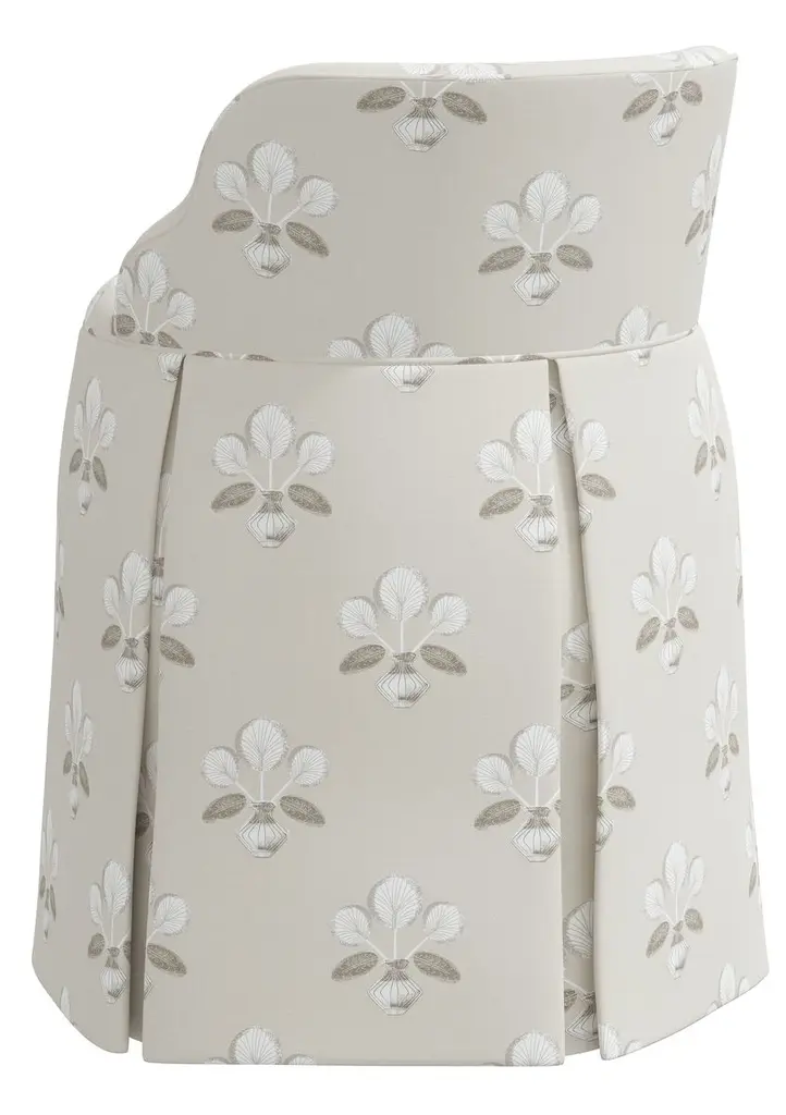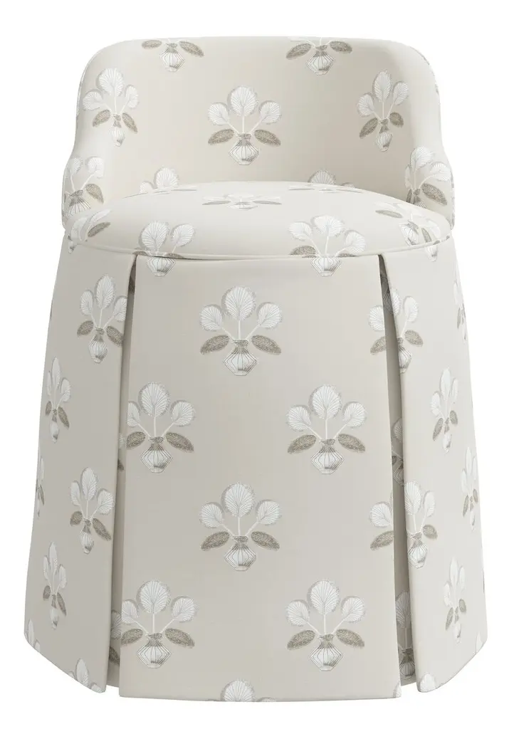 Exclusive to One Kings Lane: With its long skirt and ladylike silhouette, this vanity stool will bring a touch of feminine mystique to any space. The painterly print of flowers in vases adds to the charm. Handcrafted in the USA.