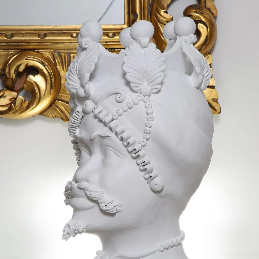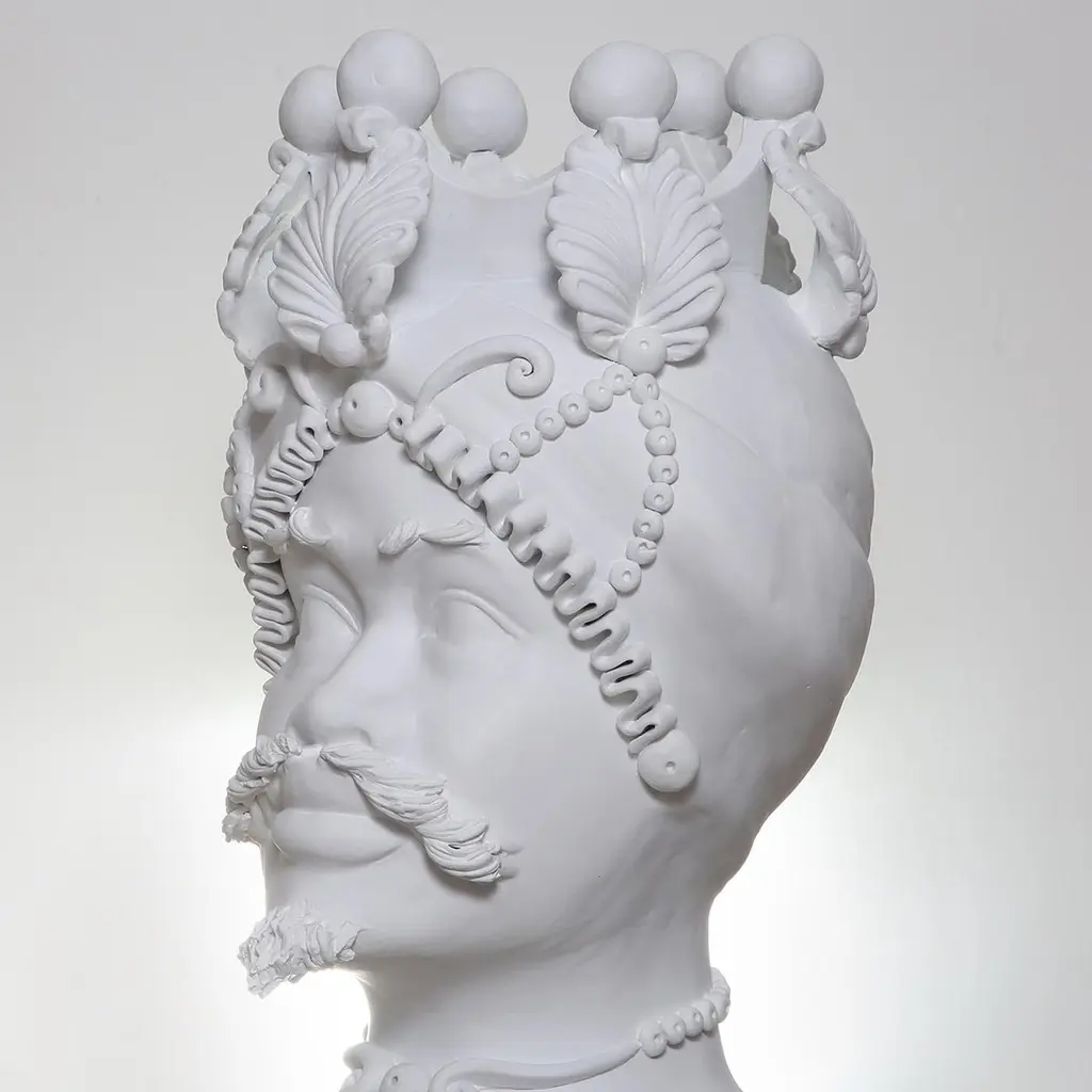 Rich in artistic and cultural significance, this anthropomorphic terracotta vase is a is an iconic homage to Sicily's rich Moorish influence. Depicting the noble visage of a Moor man, the mastery of the piece is revealed in the detailing of the regal headdress, ornate crown, bold mustache, and deep eyes. The striking natural glaze provides a dramatic touch to this traditional object of Sicilian statuary. This creation is an ideal gift for an art or history lover.