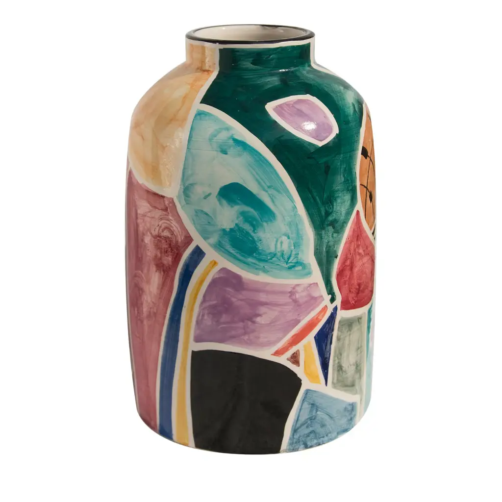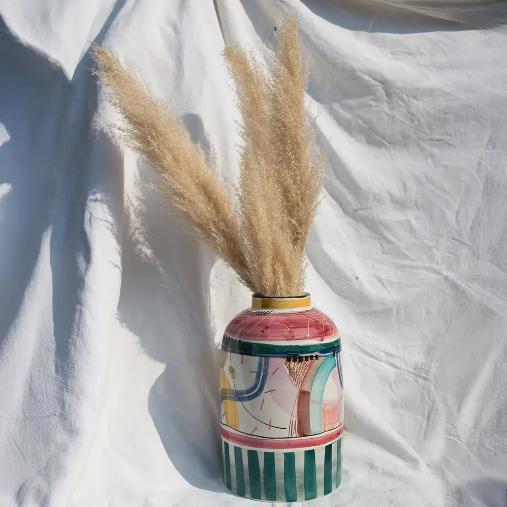 Evocative of the fascinating synthesis between Greek and Moroccan cultures - pooled together by the Mediterranean sea - this handpainted ceramic vase delivers the intensity of an authentic objet d'art. Its regular and secure brushstrokes represent the essence of the sharp simplicity of the Hellenic style, while its intriguing interplays of curves echoes stunning arabesques from Islamic tradition. Each piece boasts unpredictable and unrepeatable details.