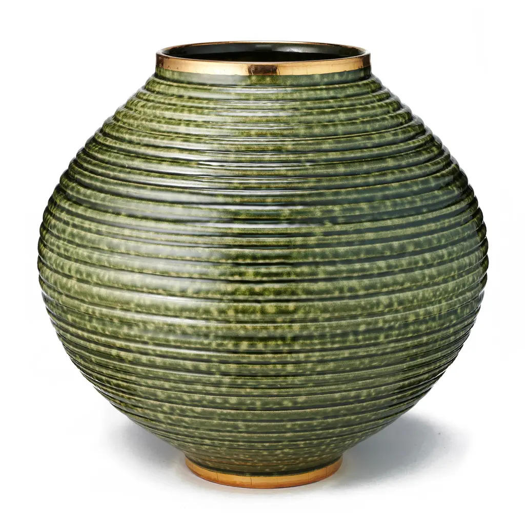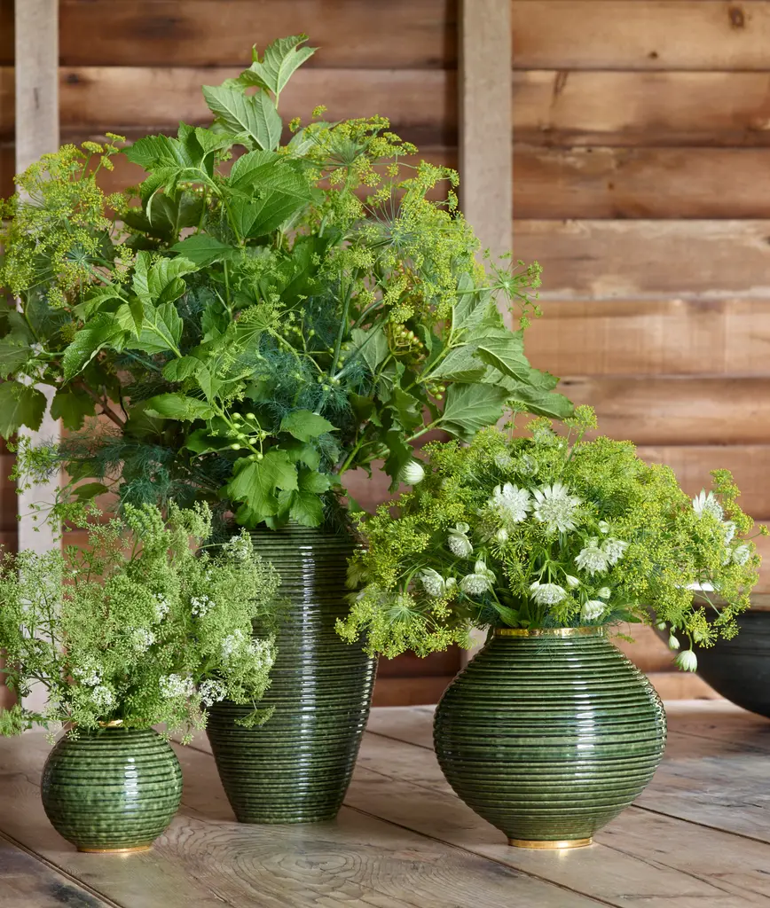 The lush green of the Calinda Vases brings a contemporary look to a room. It has been enhanced using a glazing technique that provides a textured, natural appearance, giving it an overall artisanal appeal. The shapes are elevated by hand-painted gold detailing. Care Instructions: Wipe with soft damp cloth