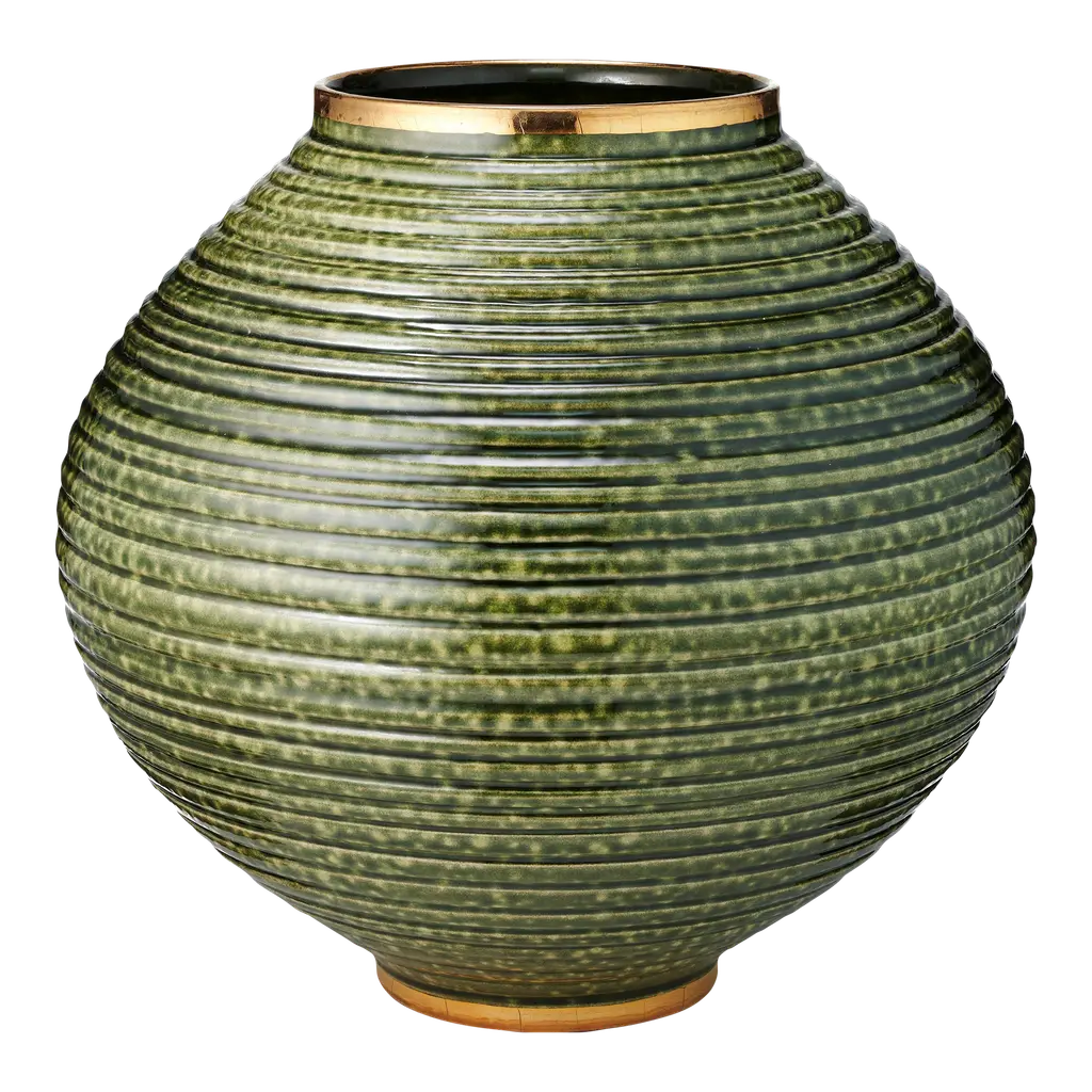 The lush green of the Calinda Vases brings a contemporary look to a room. It has been enhanced using a glazing technique that provides a textured, natural appearance, giving it an overall artisanal appeal. The shapes are elevated by hand-painted gold detailing. Care Instructions: Hand wash and hand dry