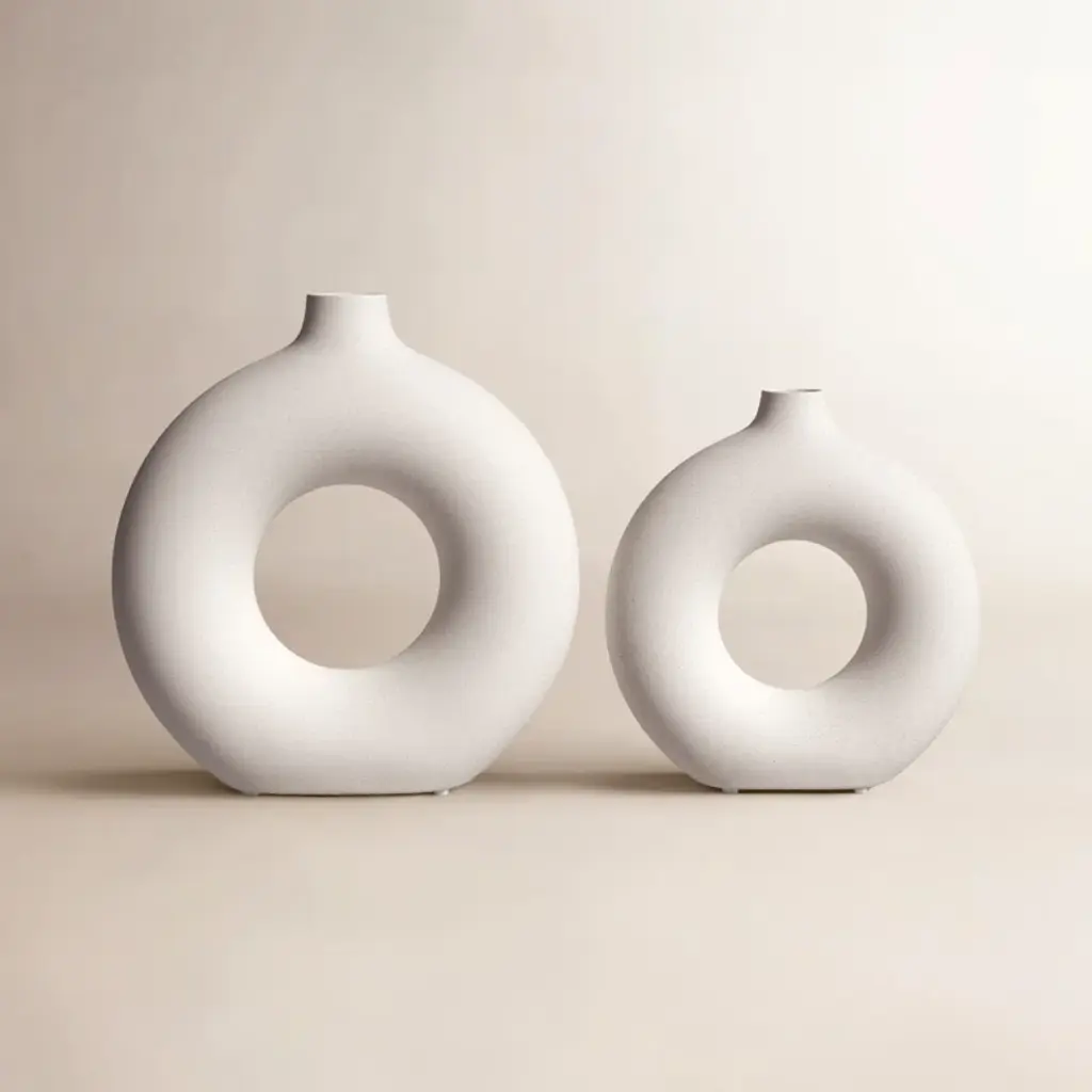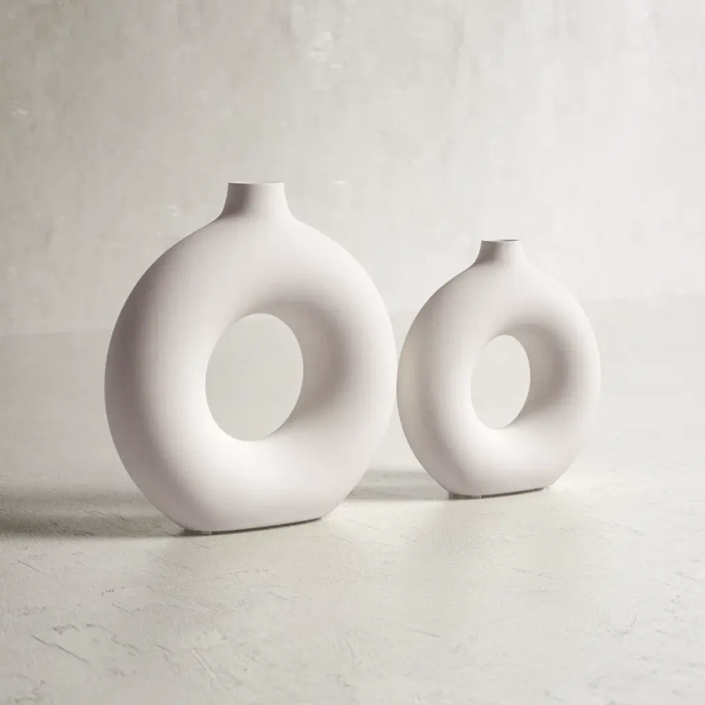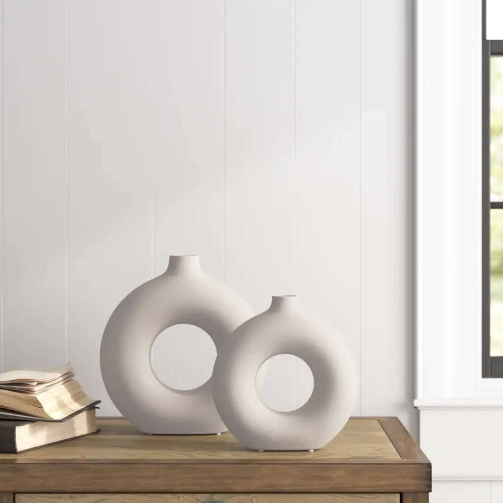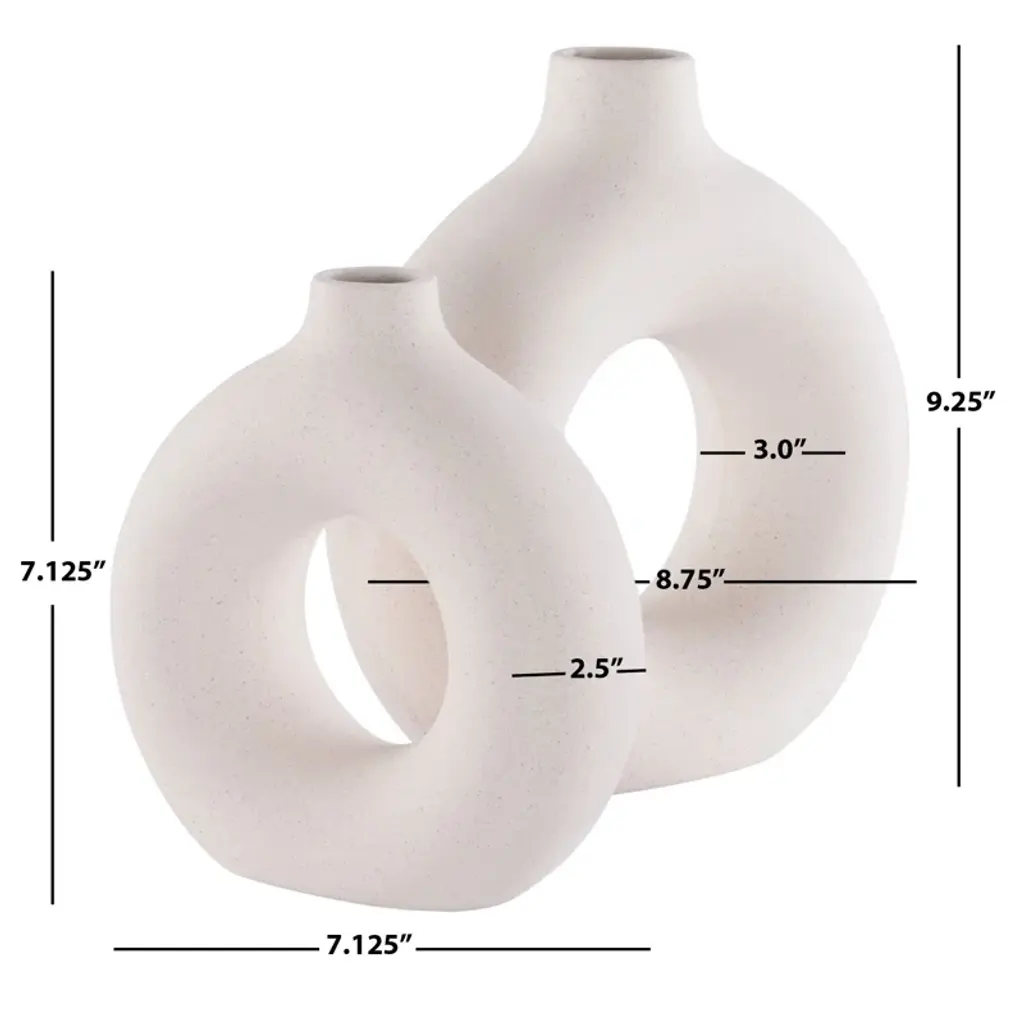 Add character and visual interest to your tabletop with our sculptural Aionna vase set. Our novelty vase features a cut-out silhouette to deliver a sculptural impact. A commanding and stylish accent for any tabletop, the vases adorn a matte beige glaze to achieve a minimal yet striking presence. Our vase set is perfect for creating an elevated display of faux botanicals and freshly cut flowers, or featuring a stand-alone accent for your mantelpiece, console, or coffee table.