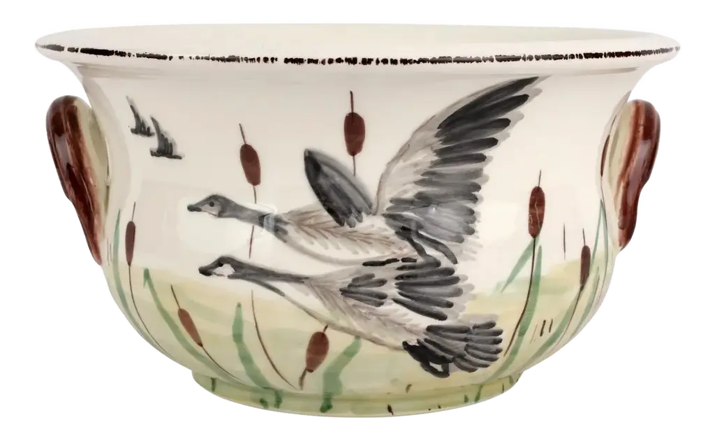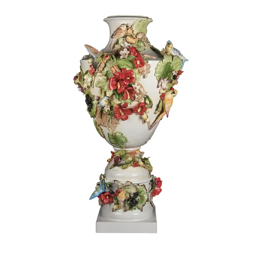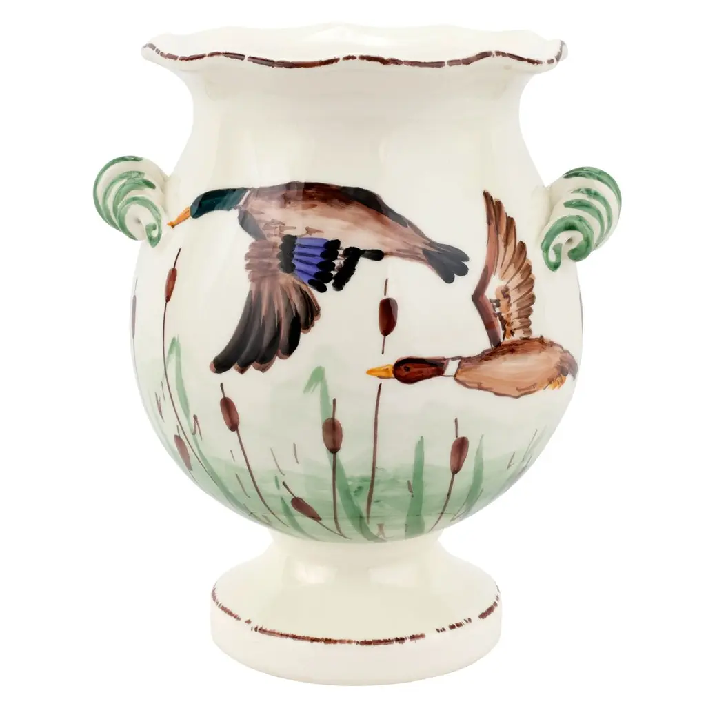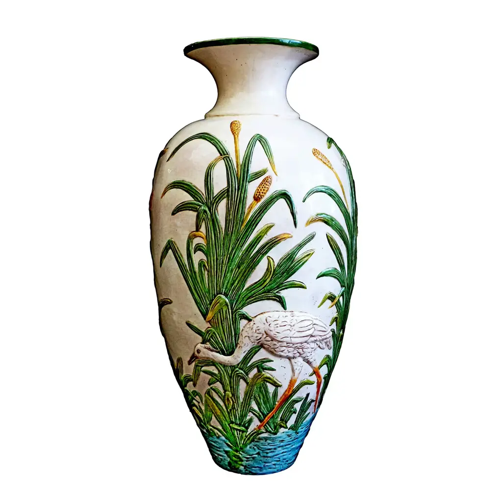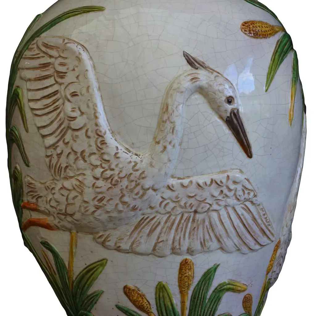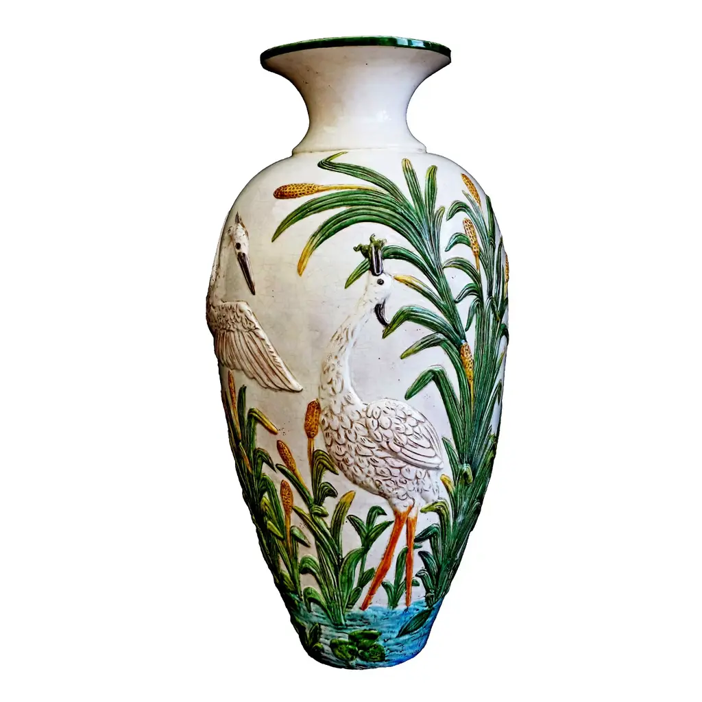 Herons captured amidst the fall grasses of their natural marsh habitat defines the minute raised motif adorning this singular ceramic vase. Majestic in its size as it is elegant in its curves, the vase boasts minute details master artisans crafted with their expert hands for making each vase and entirely unique objet d'art. Accented with vibrant glazes, it makes for a sublime addition to classic decors.