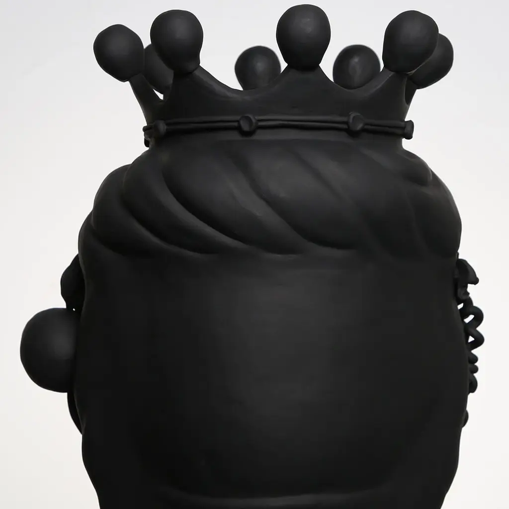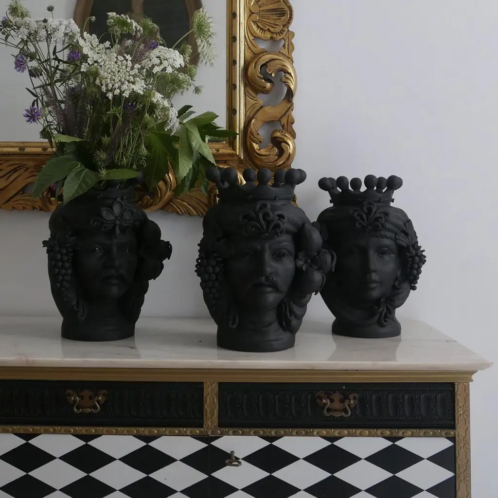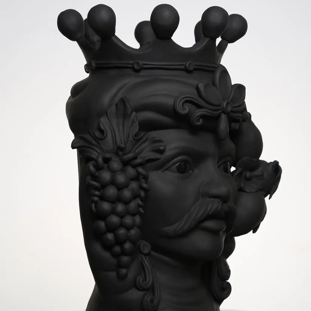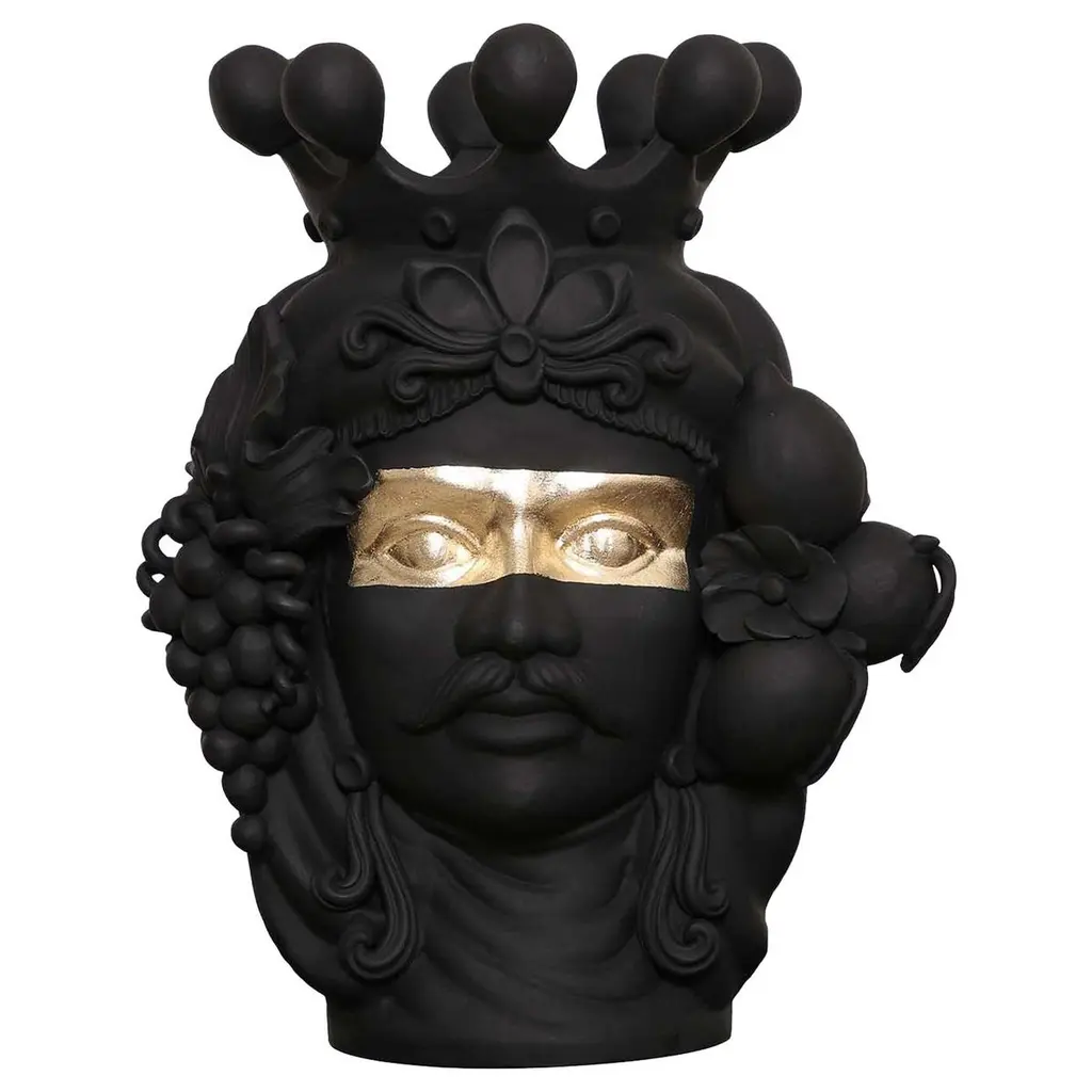 This anthropomorphic vase is made entirely by hand and painted in a black matte monochrome tint, rich in natural pigments and resin binders that provide intense color depth. Only the eyes are glazed so they stand out, emphasizing the beauty of the gaze. The piece is inspired by ancient Sicilian legends of love and revenge between a Moor and a Maiden.