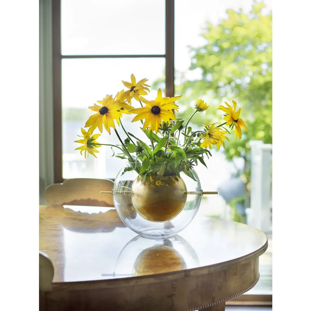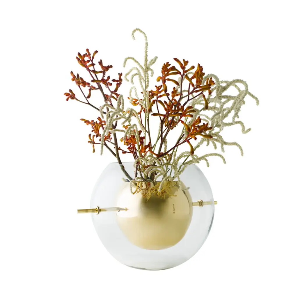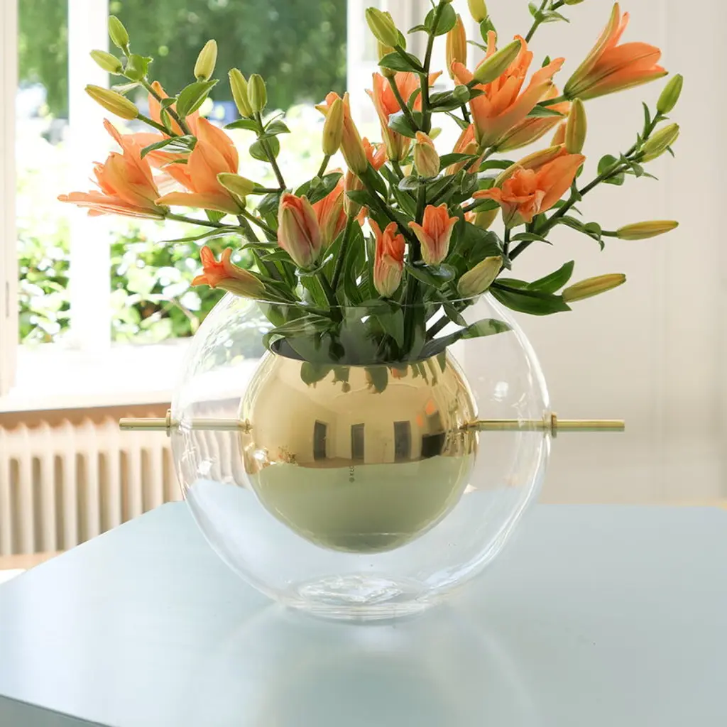 Klong's Alba vase brings a touch of sophistication to any space. The elegant vase combines a rounded glass bowl with an inner brass holder, which perfectly cradles flower bouquets and hides their stems, creating the illusion that the flowers are growing directly from a golden base. Designed by Mika Lindblad, the Alba vase is a captivating focal point, whether filled with blooms or standing gracefully on its own.