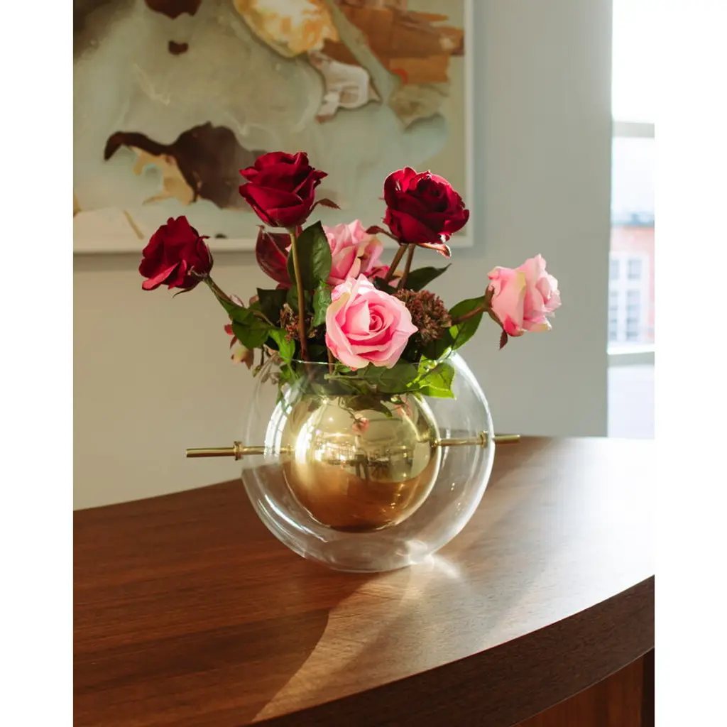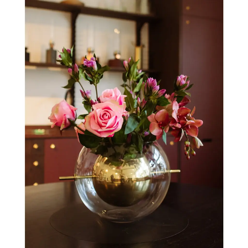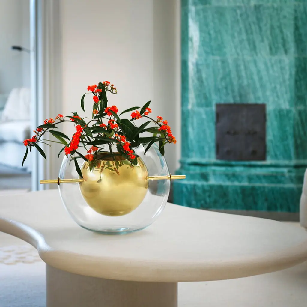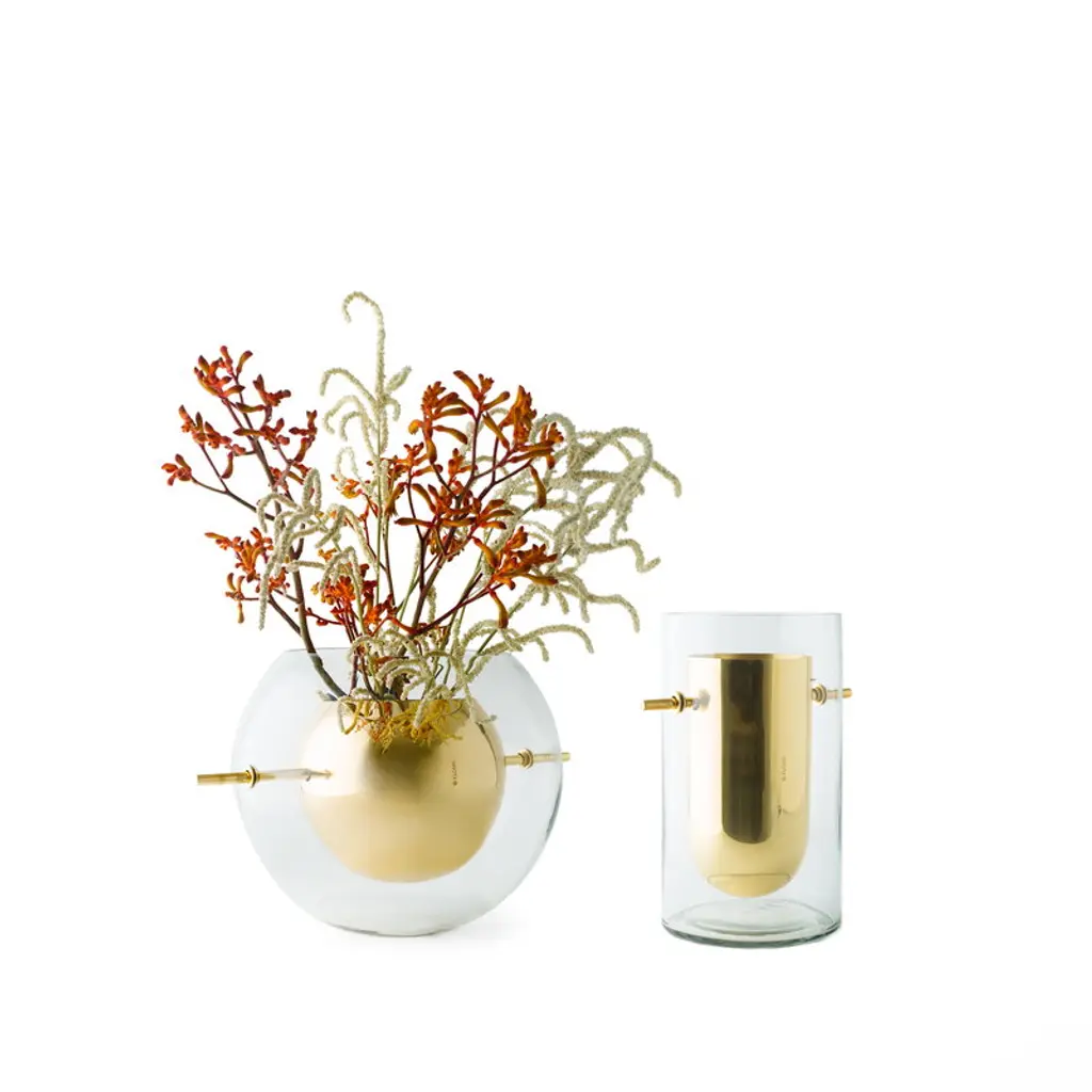 Klong's Alba vase brings a touch of sophistication to any space. The elegant vase combines a rounded glass bowl with an inner brass holder, which perfectly cradles flower bouquets and hides their stems, creating the illusion that the flowers are growing directly from a golden base. Designed by Mika Lindblad, the Alba vase is a captivating focal point, whether filled with blooms or standing gracefully on its own.