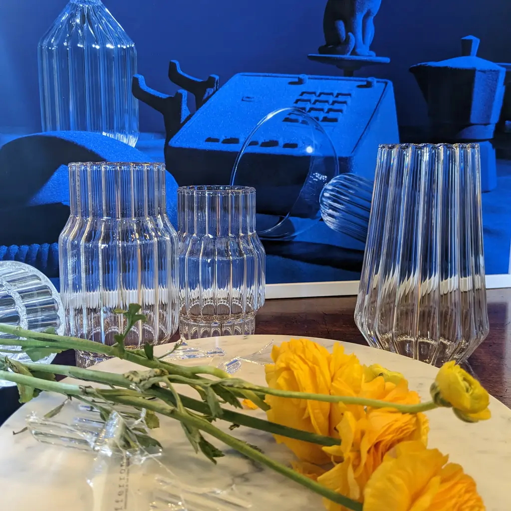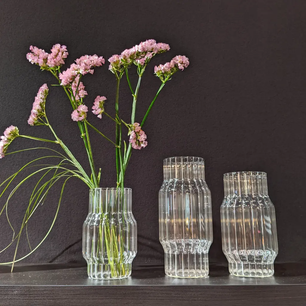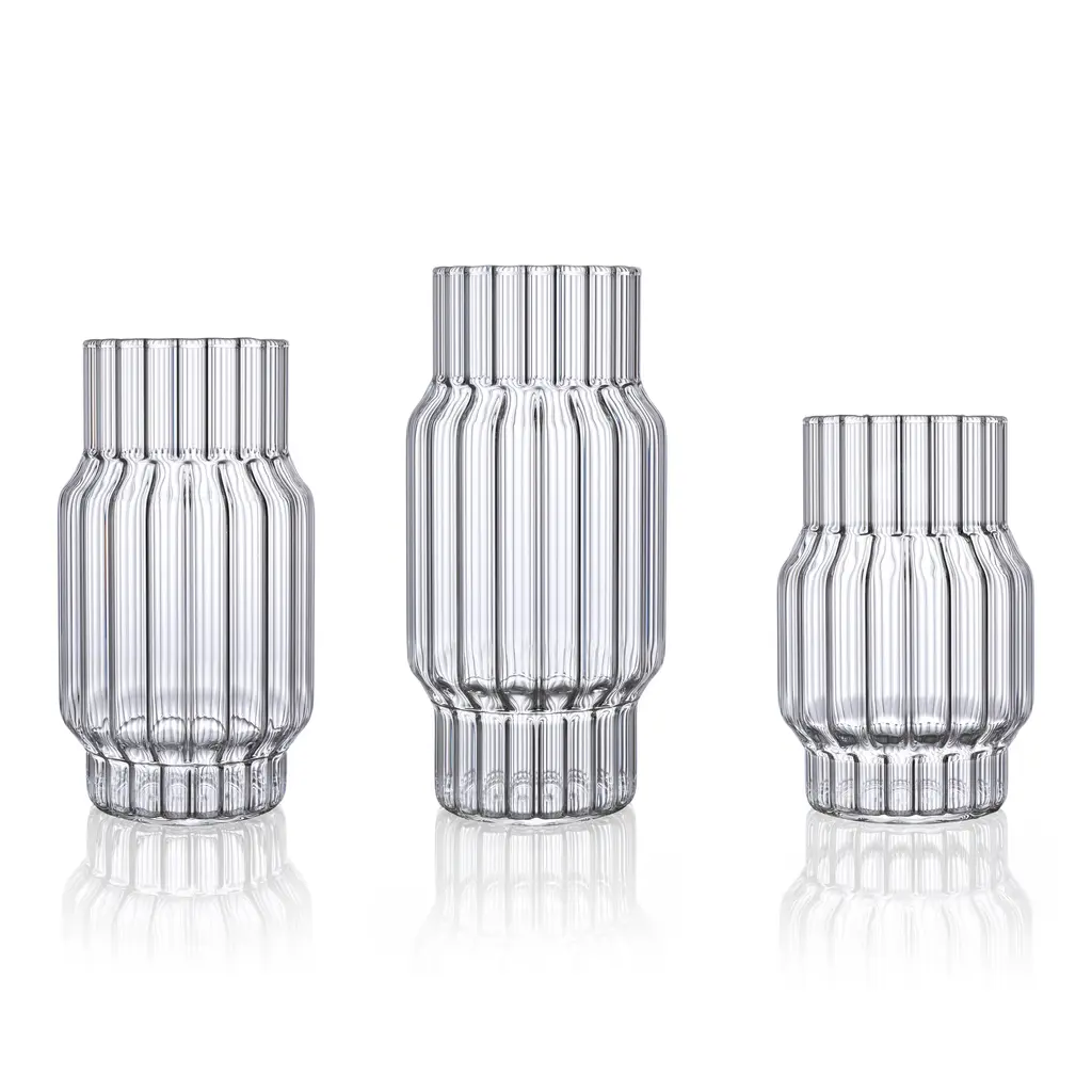 The original and unique style of the Albany Vases make a stunning choice to display blooming arrangements or a few lush plant clippings in your home or office. Whether it be a table setting, the foyer, bathroom, waiting room, or bedroom, any room can benefit from a great floral arrangement in these designer vases. Group their luxury Albany vases in a range of 3 sizes for a beautiful sculptural display. The Albany Vase Collection inverts tradition with the intricate fluting detail on the interior of the vase. The strong, simple lines of the vases make these perfect for any interior. With an innovative use of materials, the collection is made with the finest quality clear Borosilicate glass and without the use of molds. Features