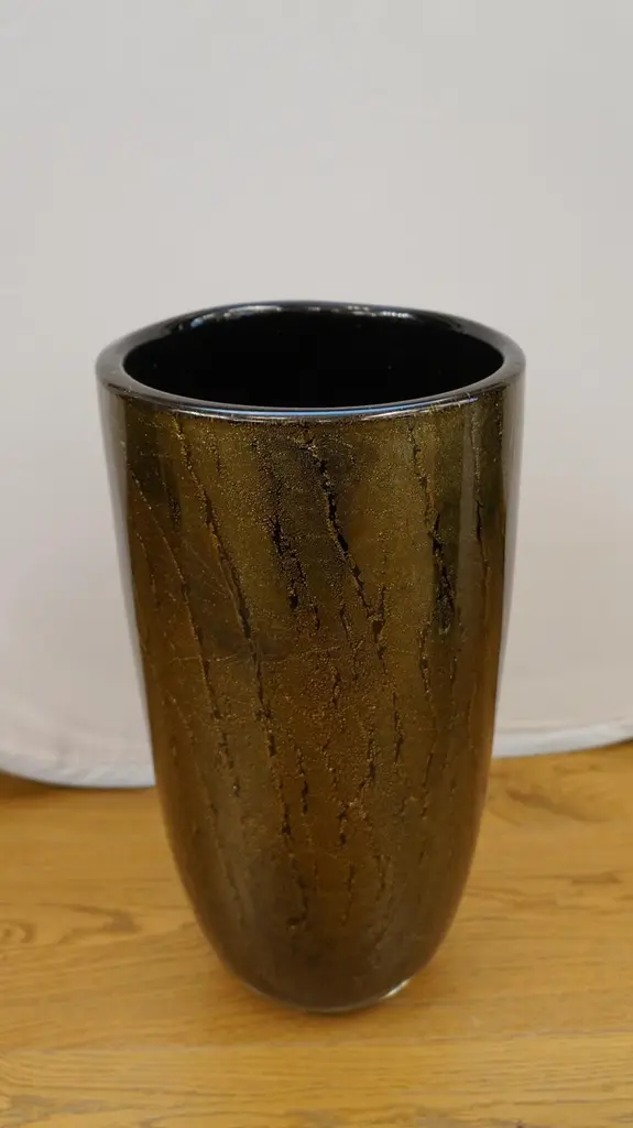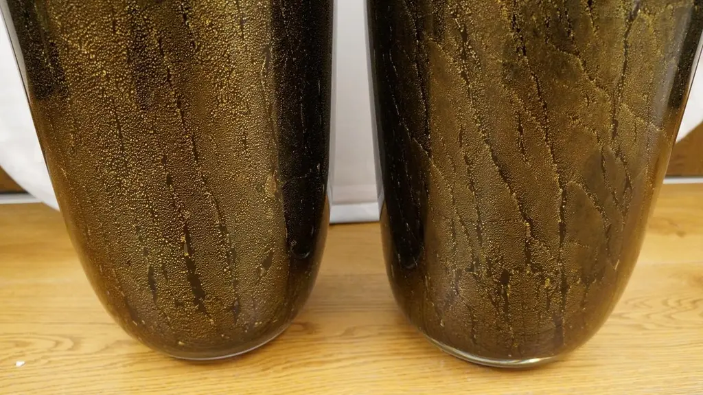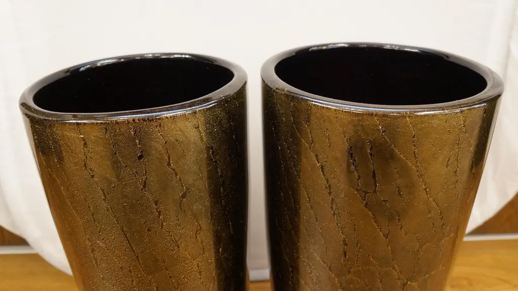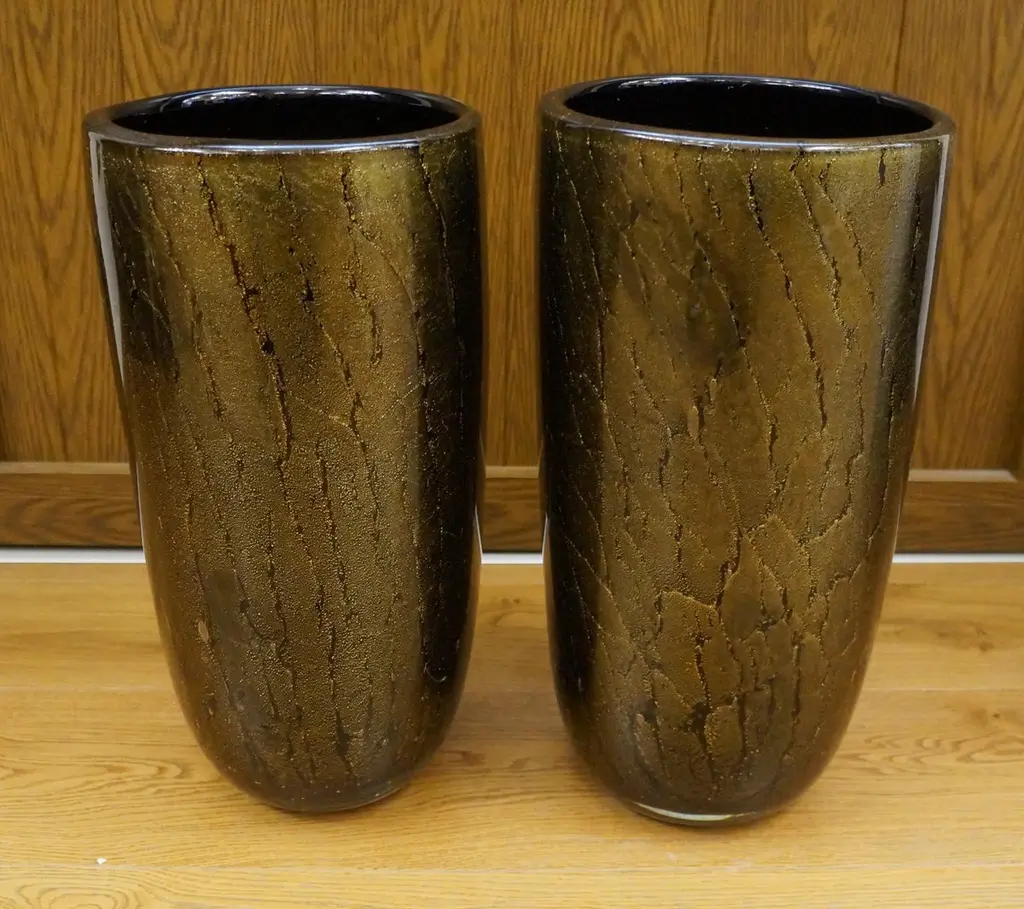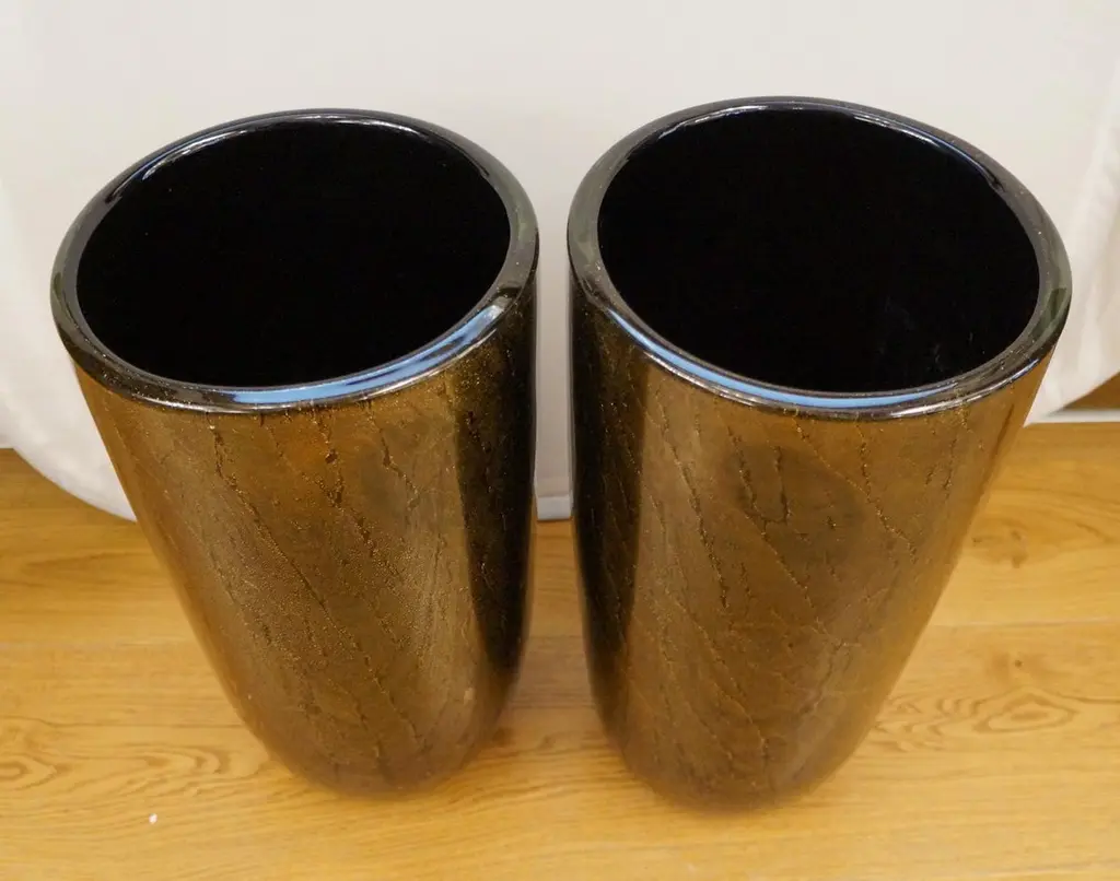 Two Murano glass blown vases, black color covered with 24-karat gold leaf.The vases are of thick glass.This fantastic Art Deco style artwork will add an extra touch of class to your environment.Project by Alberto Donà in 1990sVases signed with engraving: Alberto Donà Murano.Murano glass vases is a symbol of elegance and uniqueness, and it is a work of art that adapts to every need and acquires value over the years.