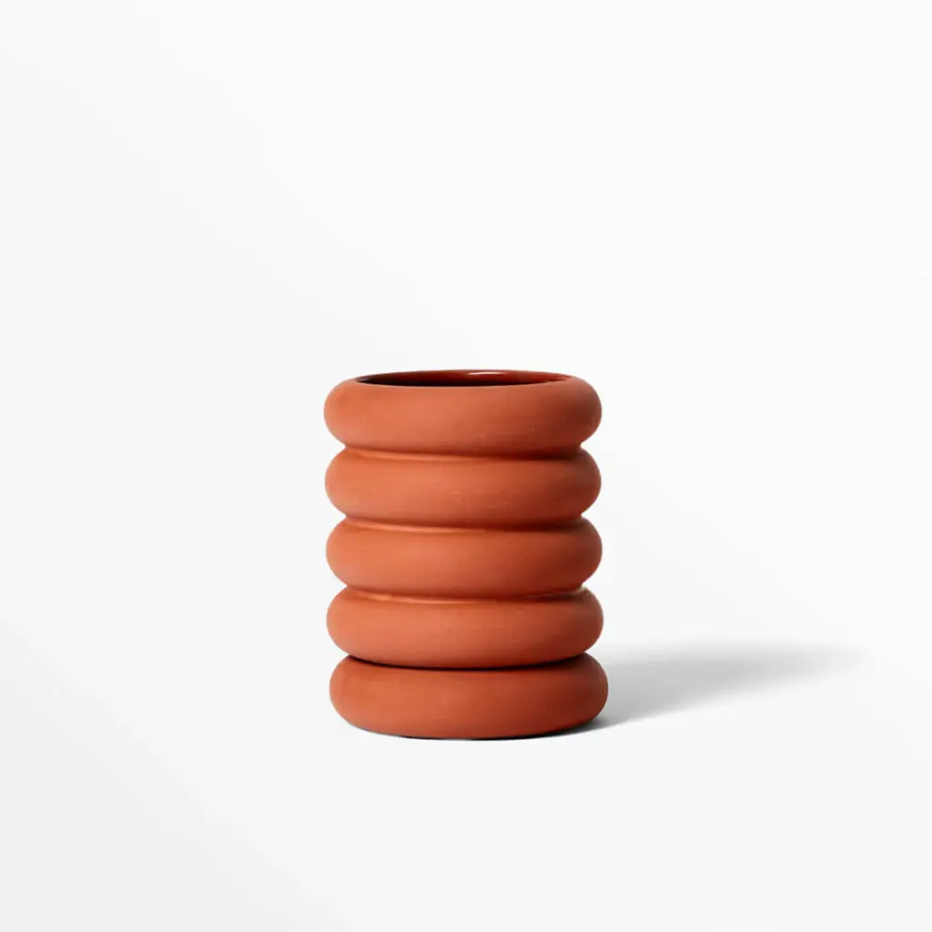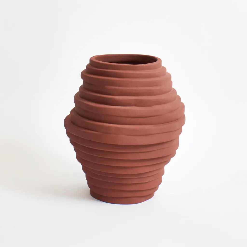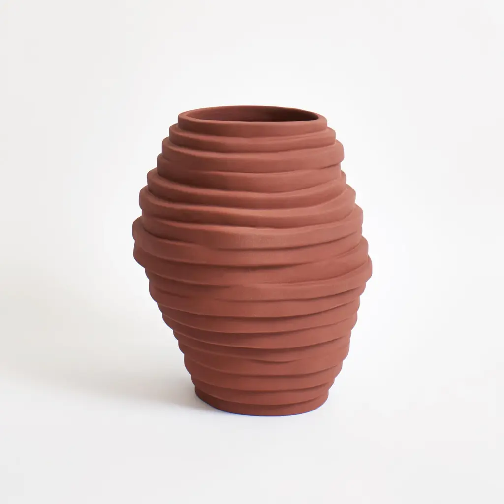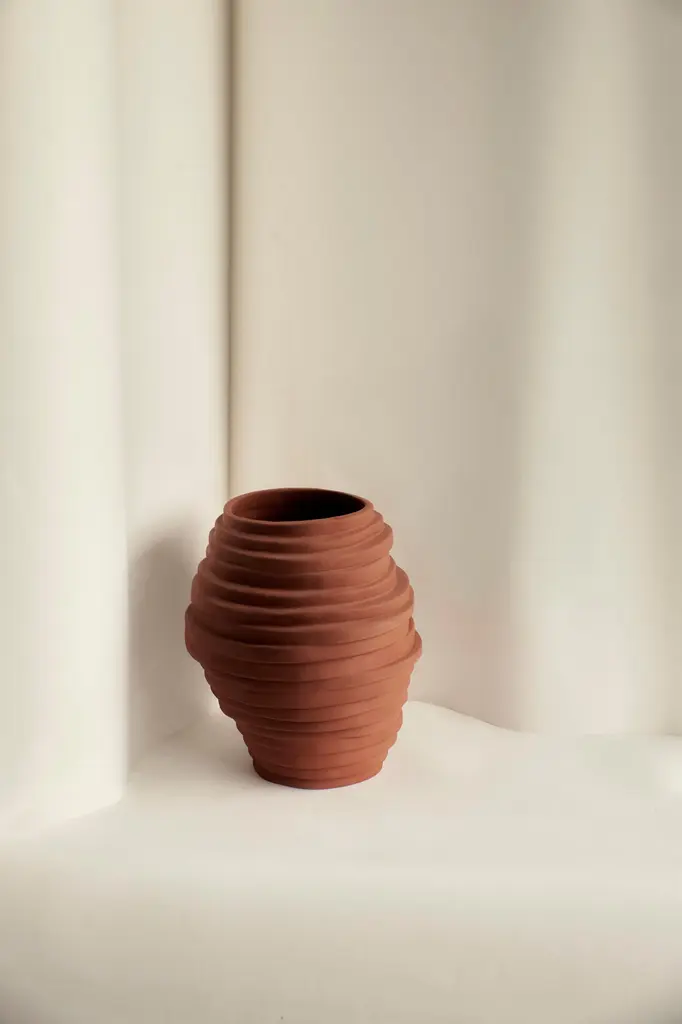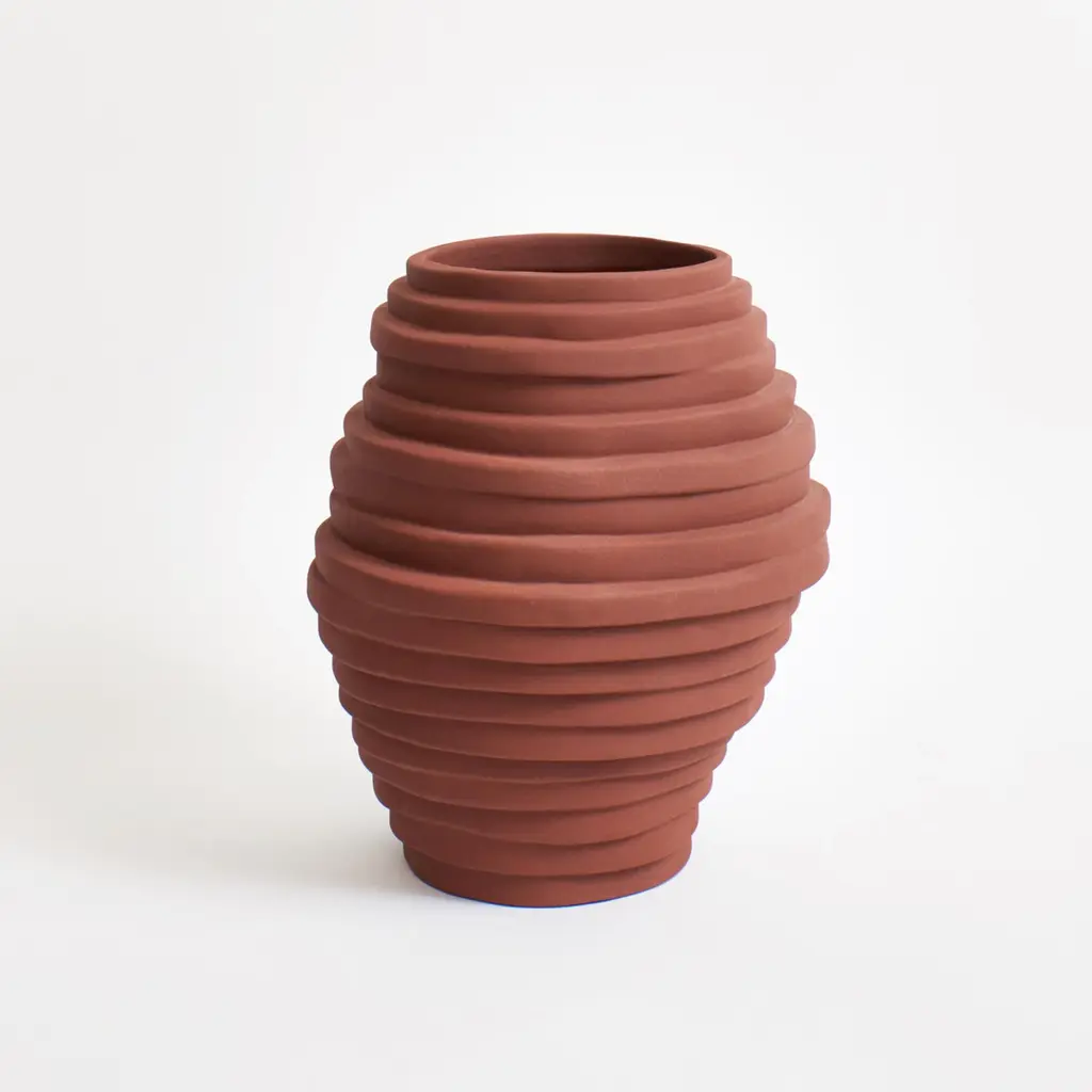 This vase draws inspiration from the Icelandic volcanic rock formations which can be found by Reynisfjara Black Sand Beach. It is sculpted by organically displacing seventeen individual layers. The Alfonso vase is finished with a contemporary matte glaze. This has a matte brick coloured finish which can appear darker in some areas than others. Please refer to images for samples of how this process can turn out. Each piece is hallmarked with a discreet P 213A embossed logo on the base. Each piece is waterproof.DeliveryWe provide complimentary free delivery for customers of the European Union on orders over 150EUR.ReturnsYou have 14 days from receiving your order to arrange your return (see our return policy). Colour : BrickMeasures: Height : 28 cmWidth : 23 cmVolume : ca 5,5 LWaterproof.