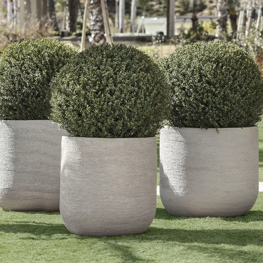 Algarve is a collection of handmade vases made of natural clay. It is available in different sizes and colors: brown, gray, blue and white. It is UV-resistant, and its high firing temperature makes it impact-resistant.