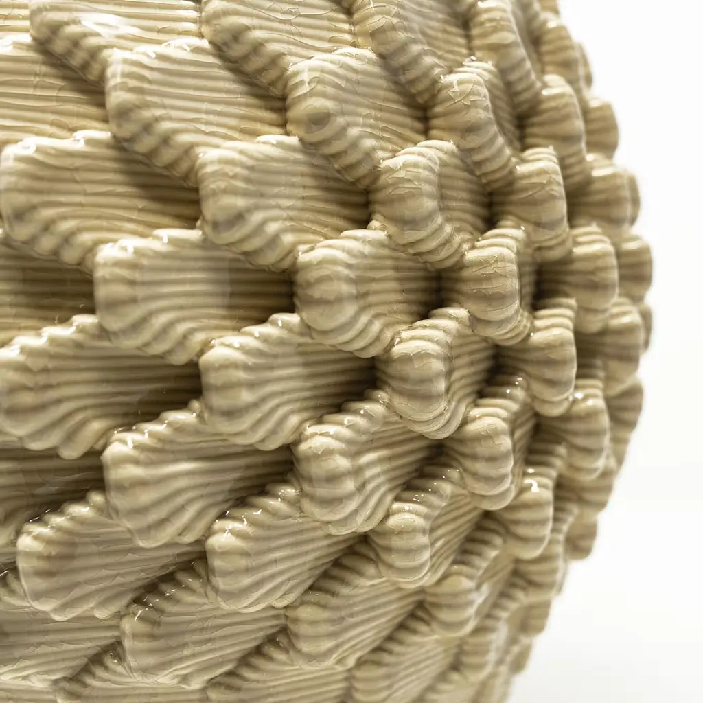 Alma, a 3D-printed vase, draws from the Caltagirone pine cone's shape, symbolizing vitality and eternity. Combining digital artistry, craftsmanship, and nature, it embodies Sicilian allure. Reflecting the fertility of the mind and novel ideas, Alma is shaped by Descartes' link between the pine cone form and the pineal gland. Additive manufacturing brings its organic silhouette to life, enhancing its essence for unique charm in spaces. Please, ask the Concierge service for further information.