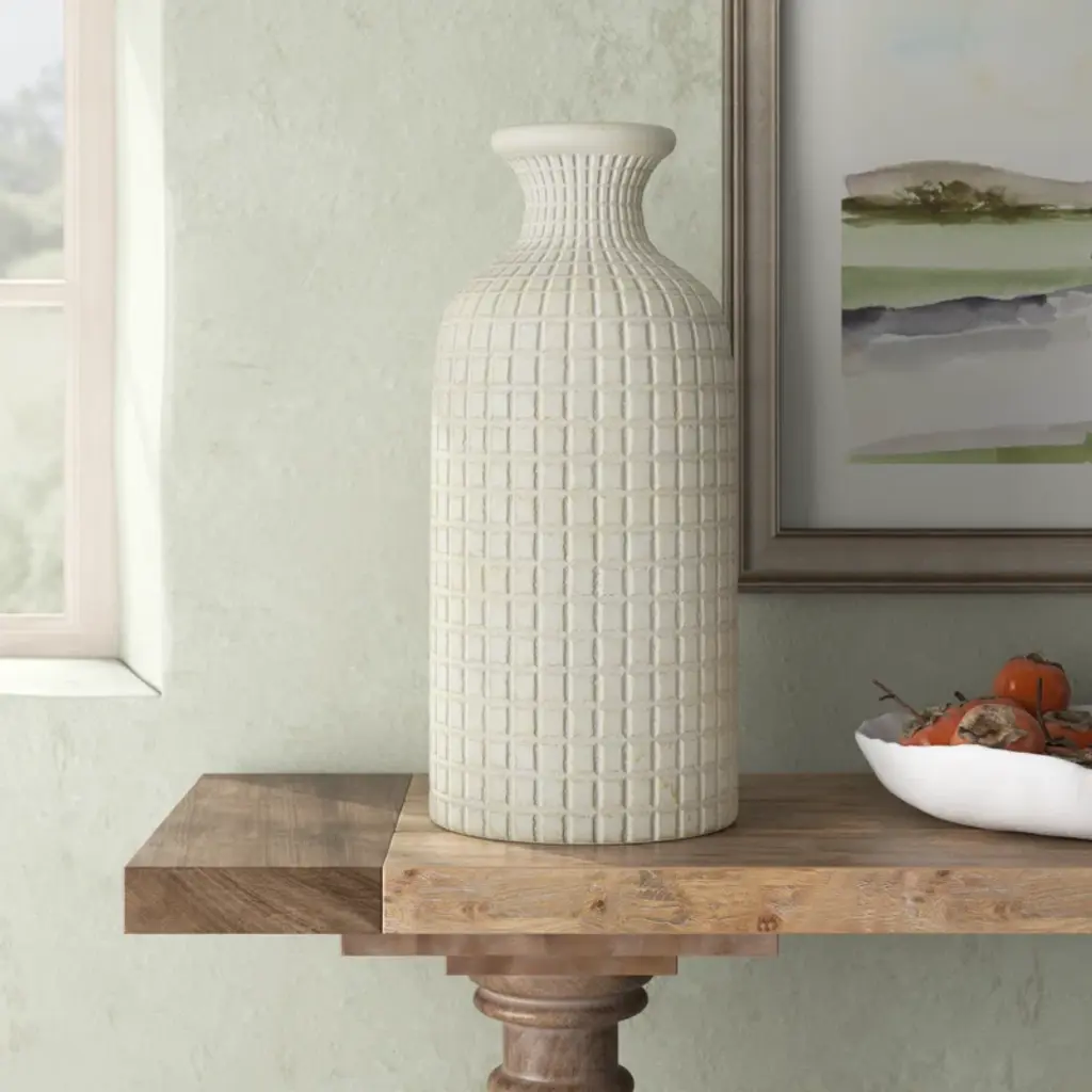 Accessorize your space effortlessly by displaying a beautiful floral arrangement or greenery with this decorative vase. Create a balanced surface space and add dimension with this beautifully crafted vase. Lovely stand-alone accent pieces fit anywhere from the entryway to the mantel for a subtle homey esthetic. Designed with felt or rubber stoppers at the base that prevent scratching furniture and table tops, as well as sliding around. Suitable for indoor use only. Made in Indonesia. This is a single cream colored vase. Modern style.