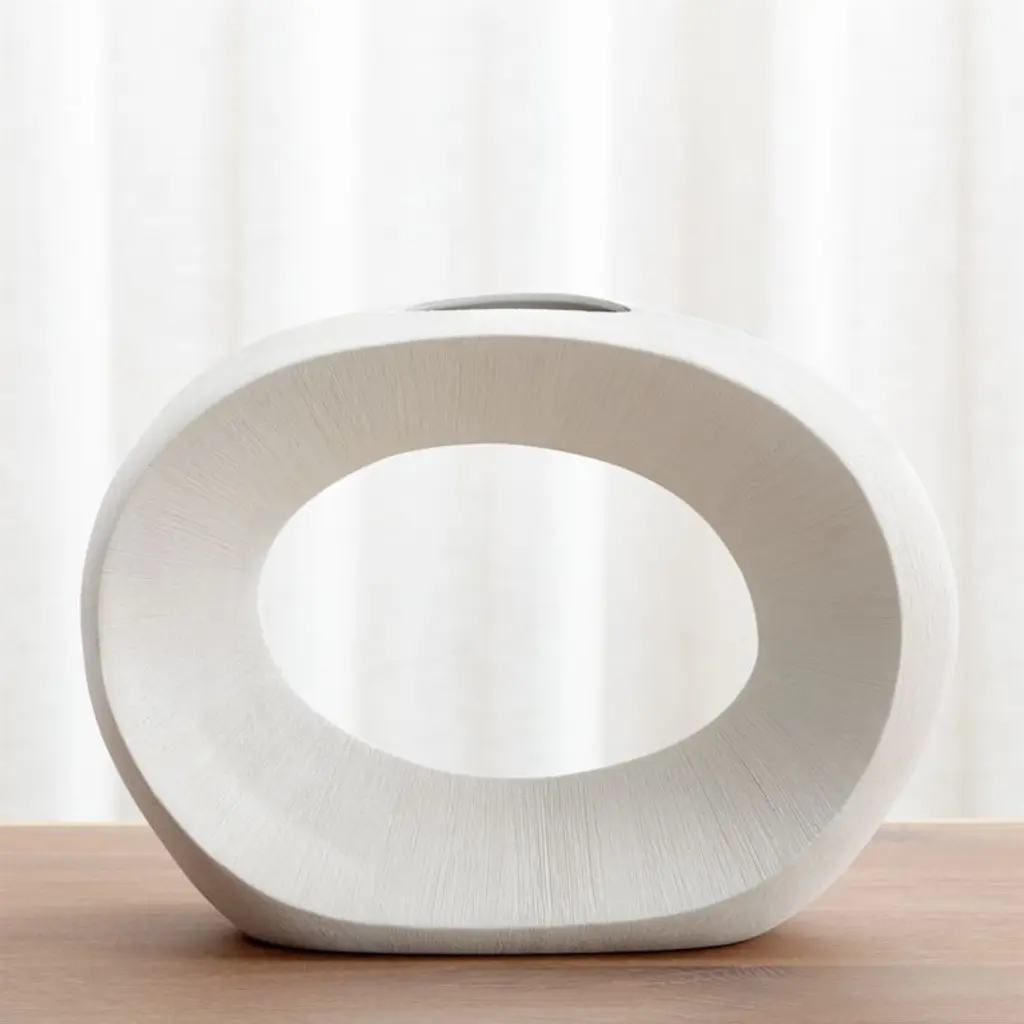 This dramatically different vase shapes a textured ring of cream-colored porcelain. Stunning on its own, the watertight vase has a small opening at the top to host a tropical leaf or single bloom. Pair with the other off-white vases in our exclusive Alura collection for sculptural impact.