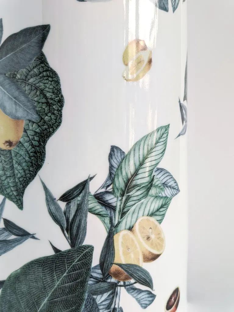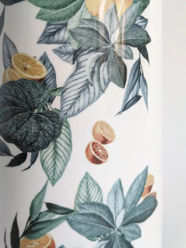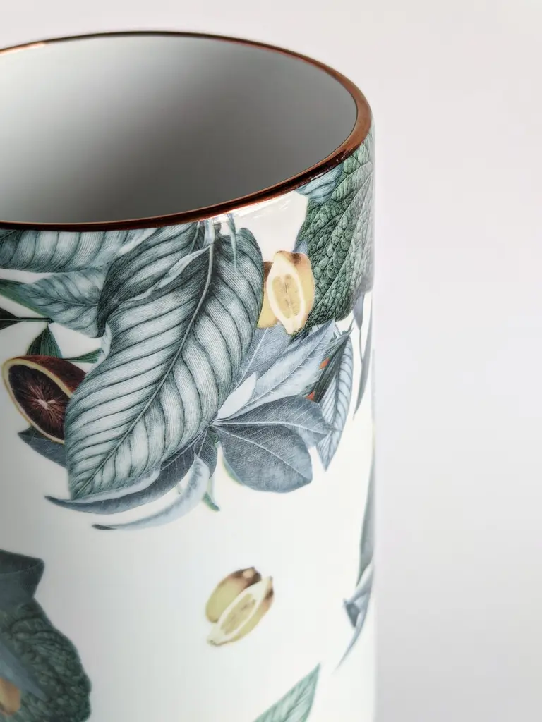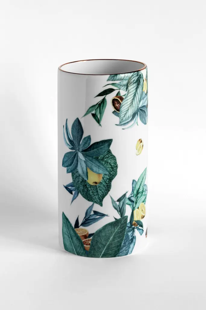 The Classic design of this porcelain vase comes back to life with retro decorations with a contemporary flavour. The Italian coast of Amalfi inspires this design where leaves and citrus fit together and fly all over the surface.Cylindrical porcelain vase.