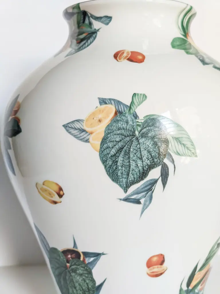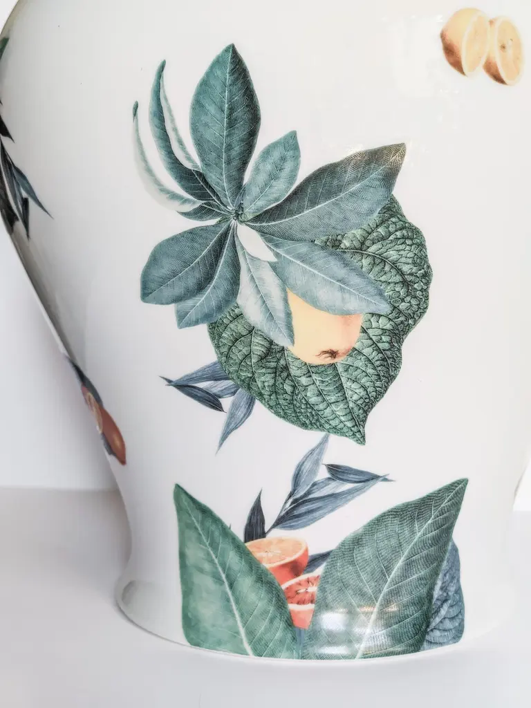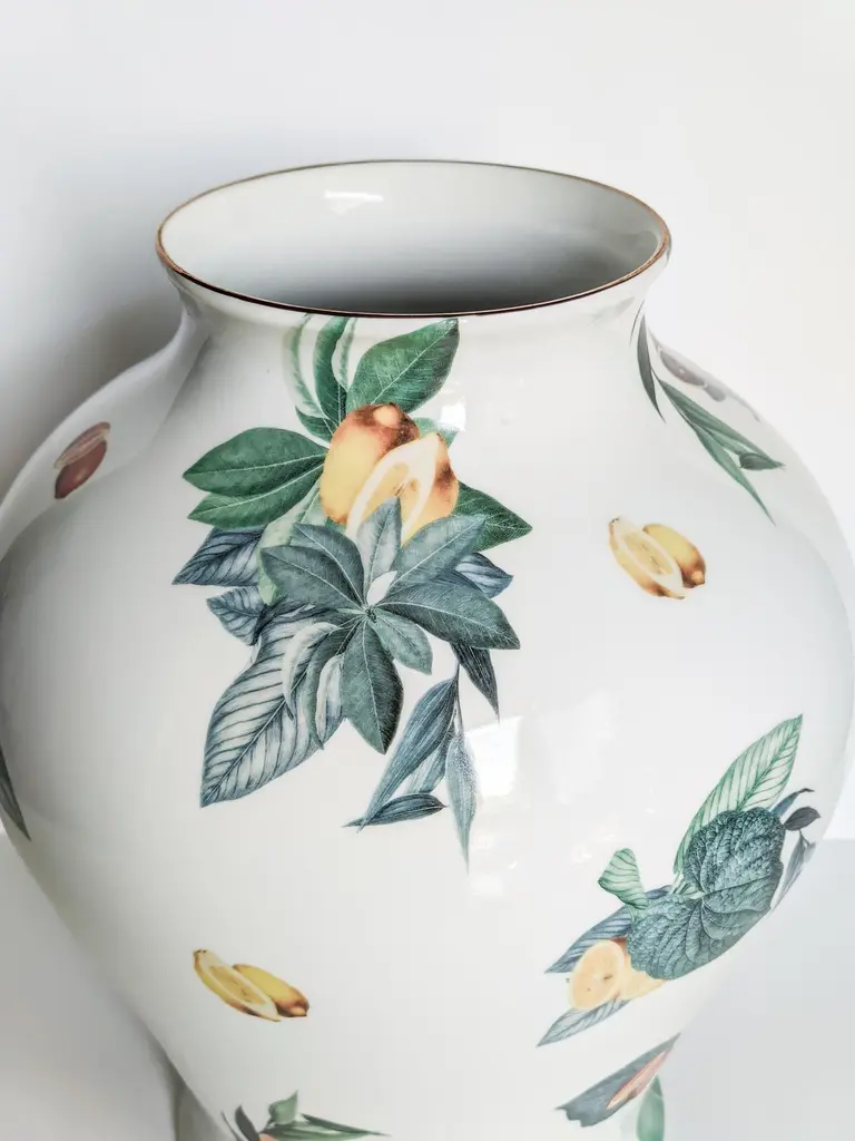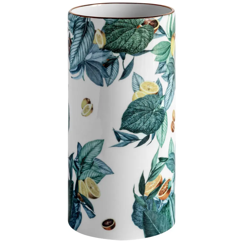 The Classic design of this porcelain vase comes back to life with retro decorations with a contemporary flavor. The Italian coast of Amalfi inspires this design where leaves and citrus fit together and fly all over the surface.