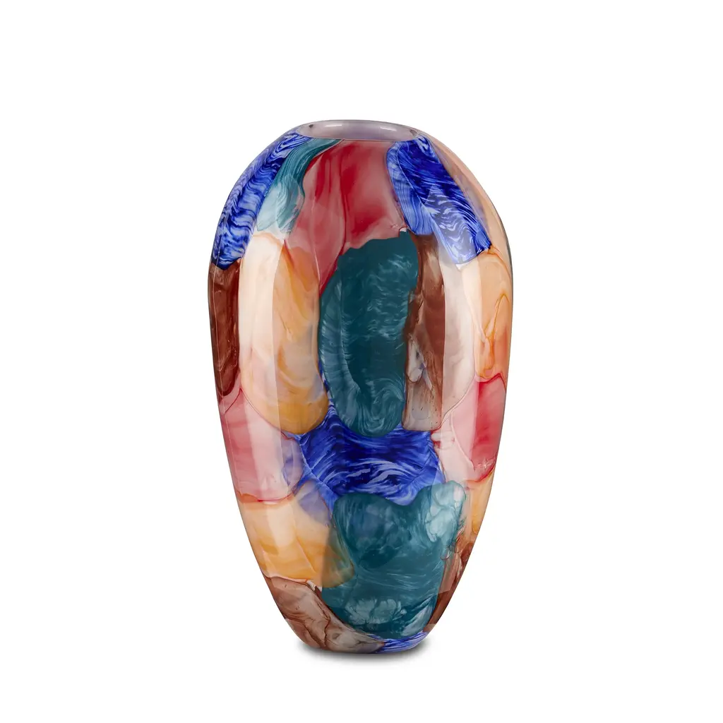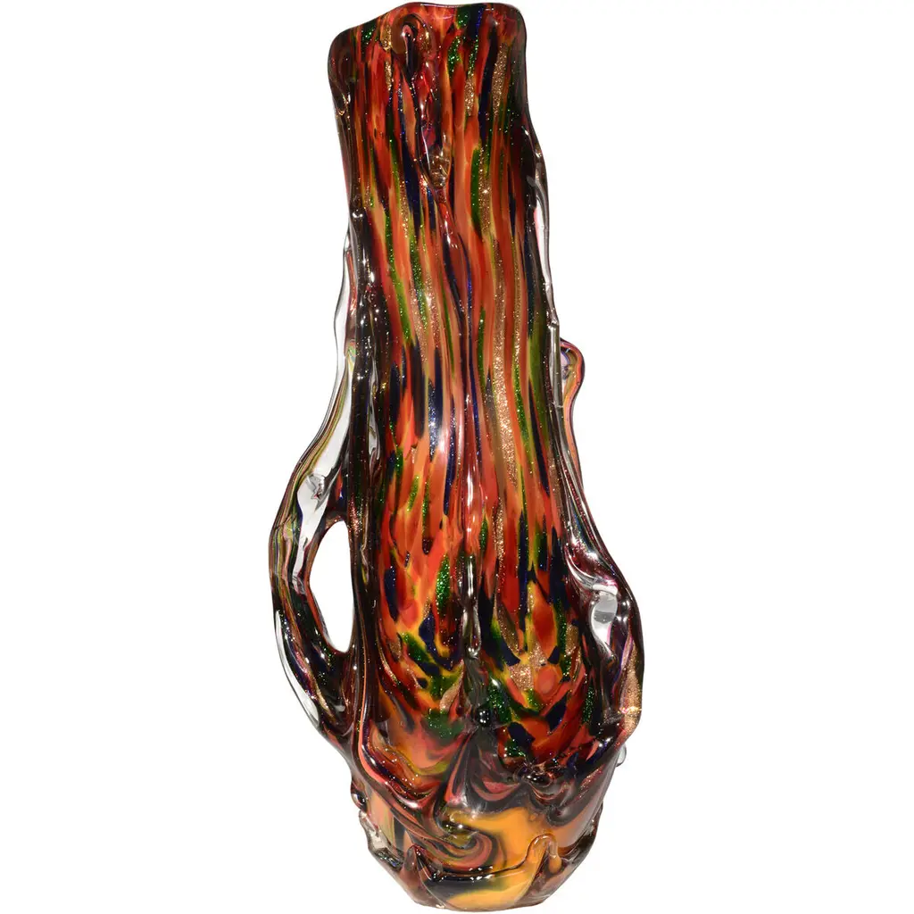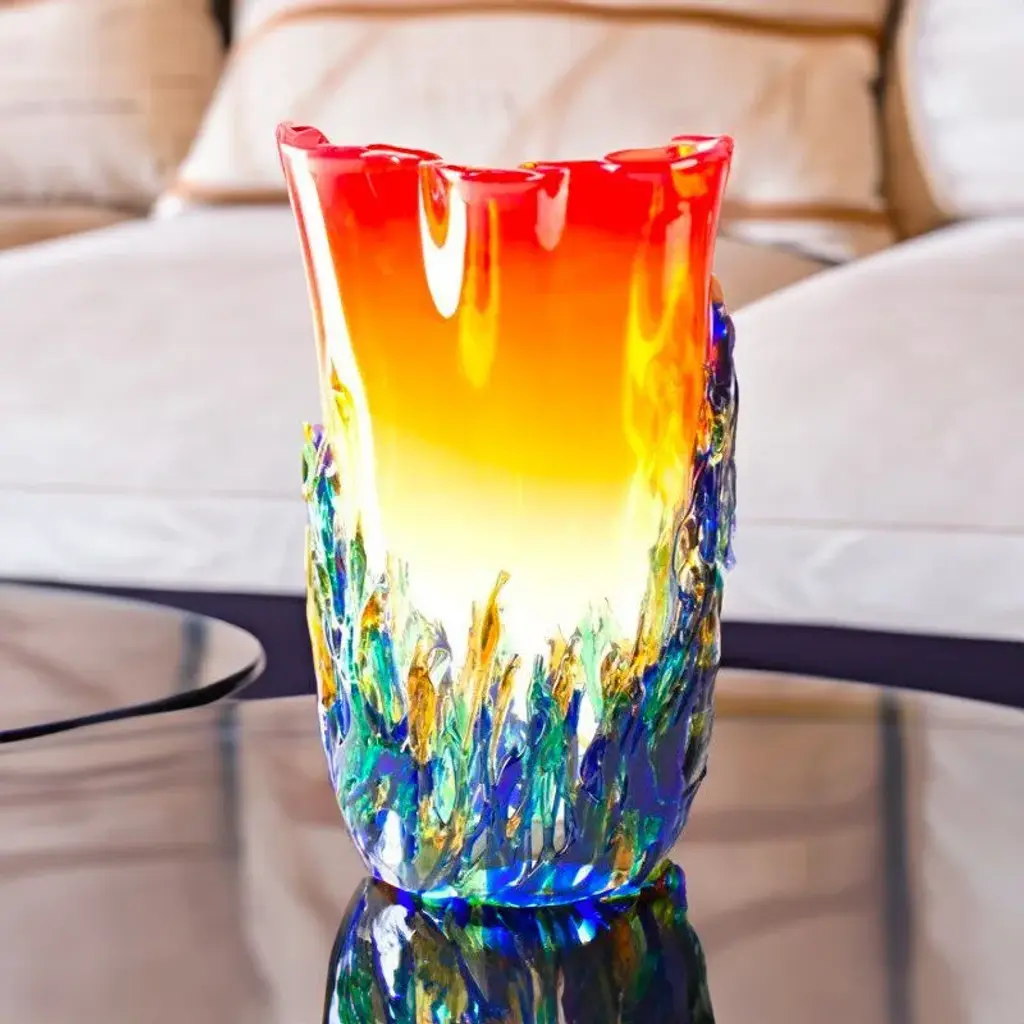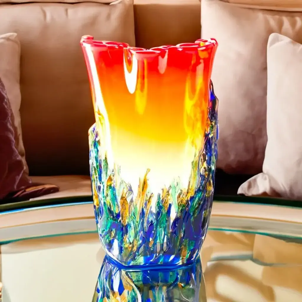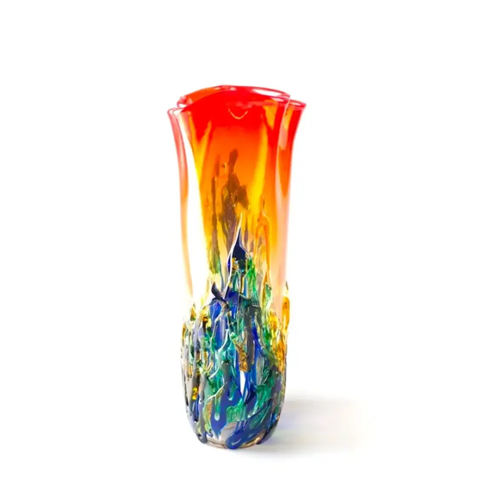 AMALFI RED TALL is a Murano glass modern vase with an elongated shape, created in red color. A luxury Murano home decor object to decorate your living room with style. Incandescent filaments of blue, green, and amber glass envelop this line of hand-blown glass vases, giving life to glass artworks that leave you in awe at first sight. The unique shape of these decorative vases, made in Italy, is sinuous and almost fluid. These exceptional handcrafted vases were forged in the renowned workshops of Murano, thanks to a powerful blend of passion, talent, and unparalleled skills rooted in decades of glassmaking experience. All our products are artisanal and of the highest production quality. Non-substantial variations in shape, size, color, and/or minor imperfections are inevitable and are typical of manual glasswork, highlighting the artisanal craftsmanship.