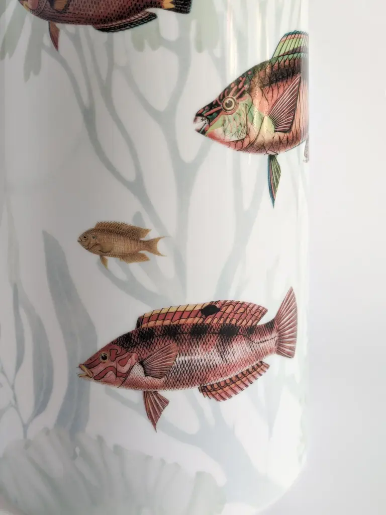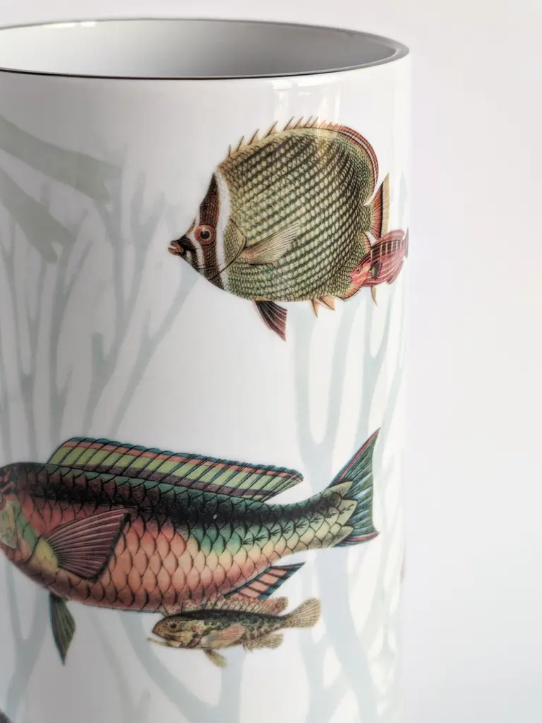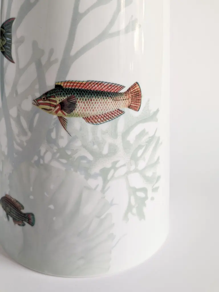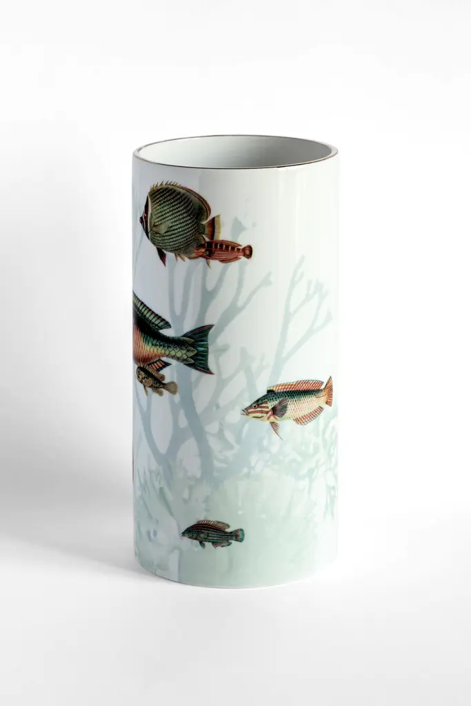 Inspired by the Japanese Amami Islands ringed by coral reefs, this joyful vase designed by Vito Nesta features a playful pattern of different-sized fish in dazzling colors. Crafted of fine porcelain, this vase will make a delightful addition to a table or a sideboard in any contemporary or Classic-style home.Red/green fishes version.