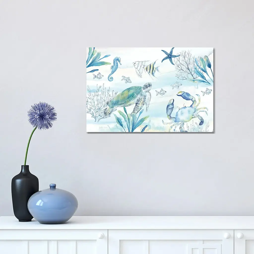 Distinguished by a foreground decoration of a school of golden fish juxtaposed against a light blue coral reef backdrop, this stunning vase is part of a porcelain series from the extensive Grand Tour Collection by artist Vito Nesta. A singular work of decorative art, this piece will make a statement in any modern interior or seaside home.