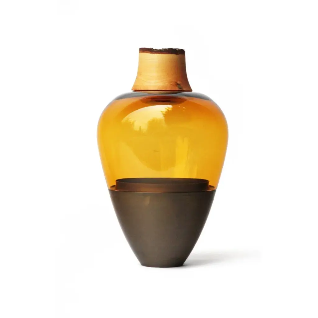 Amber And Patinated Brass Sculpted Vase In Blown Glass By Pia Wüstenberg