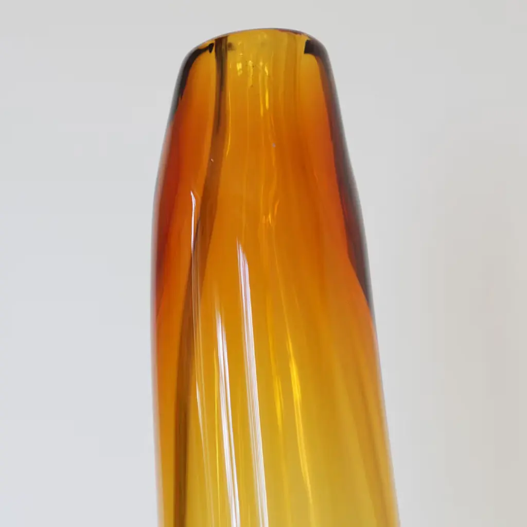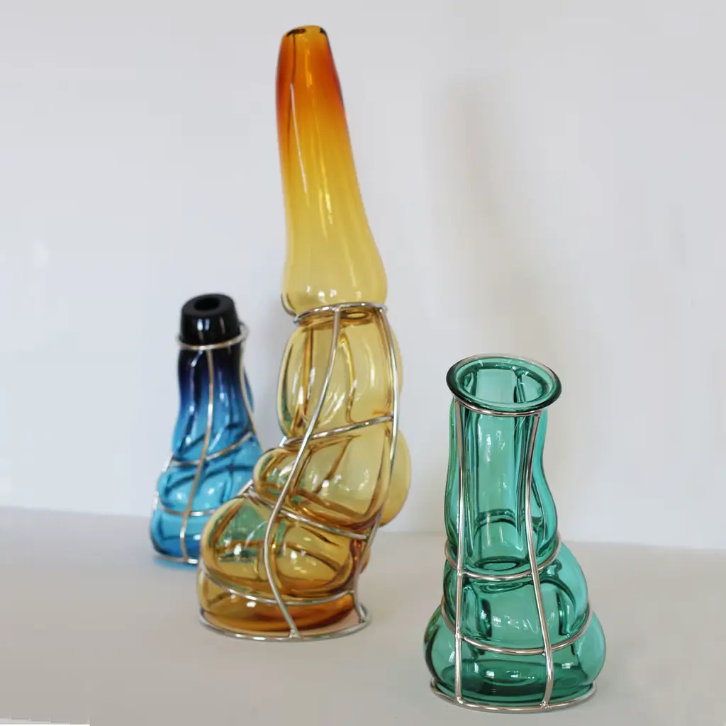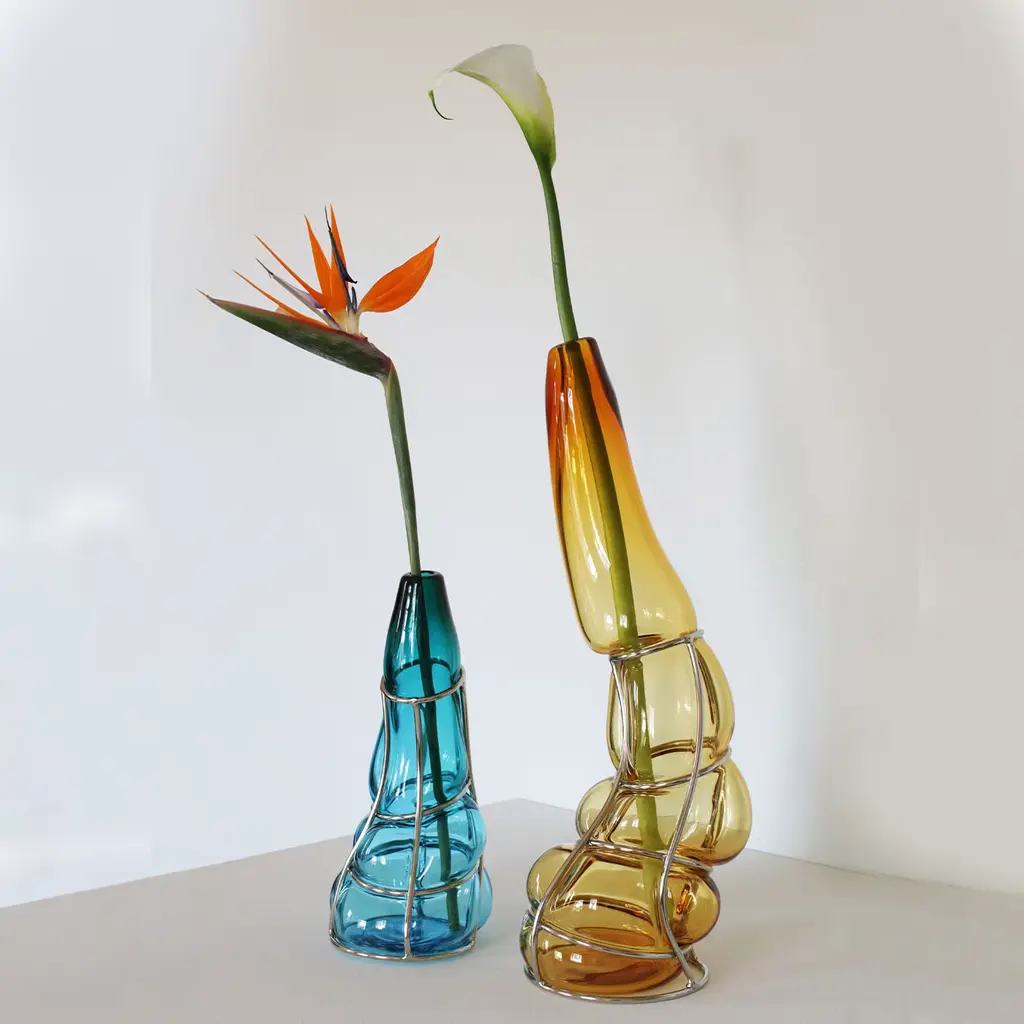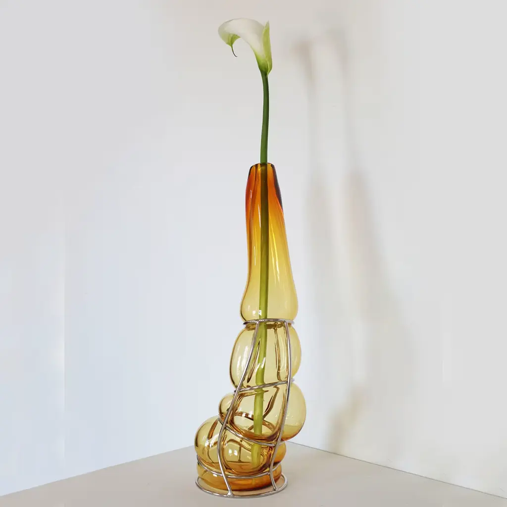 This ingabbiato vase features an elongated amber stem with varying color intensities from the irregular glass thickness, shaped by ancient blowing techniques. Slight variations may apply in the replica due to a handmade production process. Each artifact is unique: the height, the “fullness,” the cut, and the color shading depends on the exact moment the glass is blown inside the metal cage by the Master glassmaker. Alice collaborates with Murano artisans to revive the ingabbiato technique, honoring Italian heritage.. Metal finish: nickel plated. Mouth: Ø2cm.