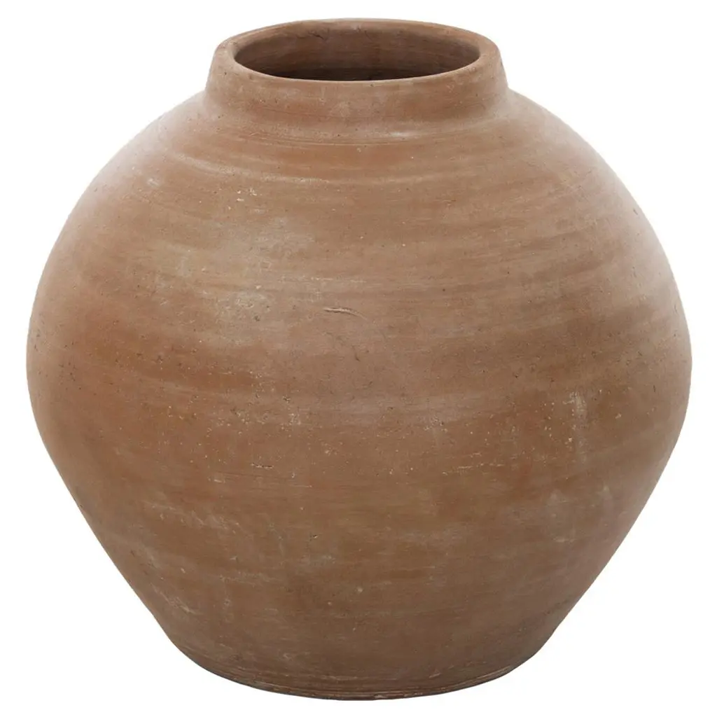 The Amber Lewis x Four Hands Bosa Vase from Four Hands delights viewers using a contemporary design with a classic genesis. Its soothing silhouette and textured terracotta material pair classical allure with modern charm, lending a rustic touch to any setting. The vase's simple yet elegant form, crafted from terracotta, expands upward from a circular base, curving inward to a central opening, evoking timeless sophistication with a fresh twist. The vase becomes versatile decor by combining a sense of historical intricacy with minimalist simplicity, adding tasteful texture and unique character to any space.