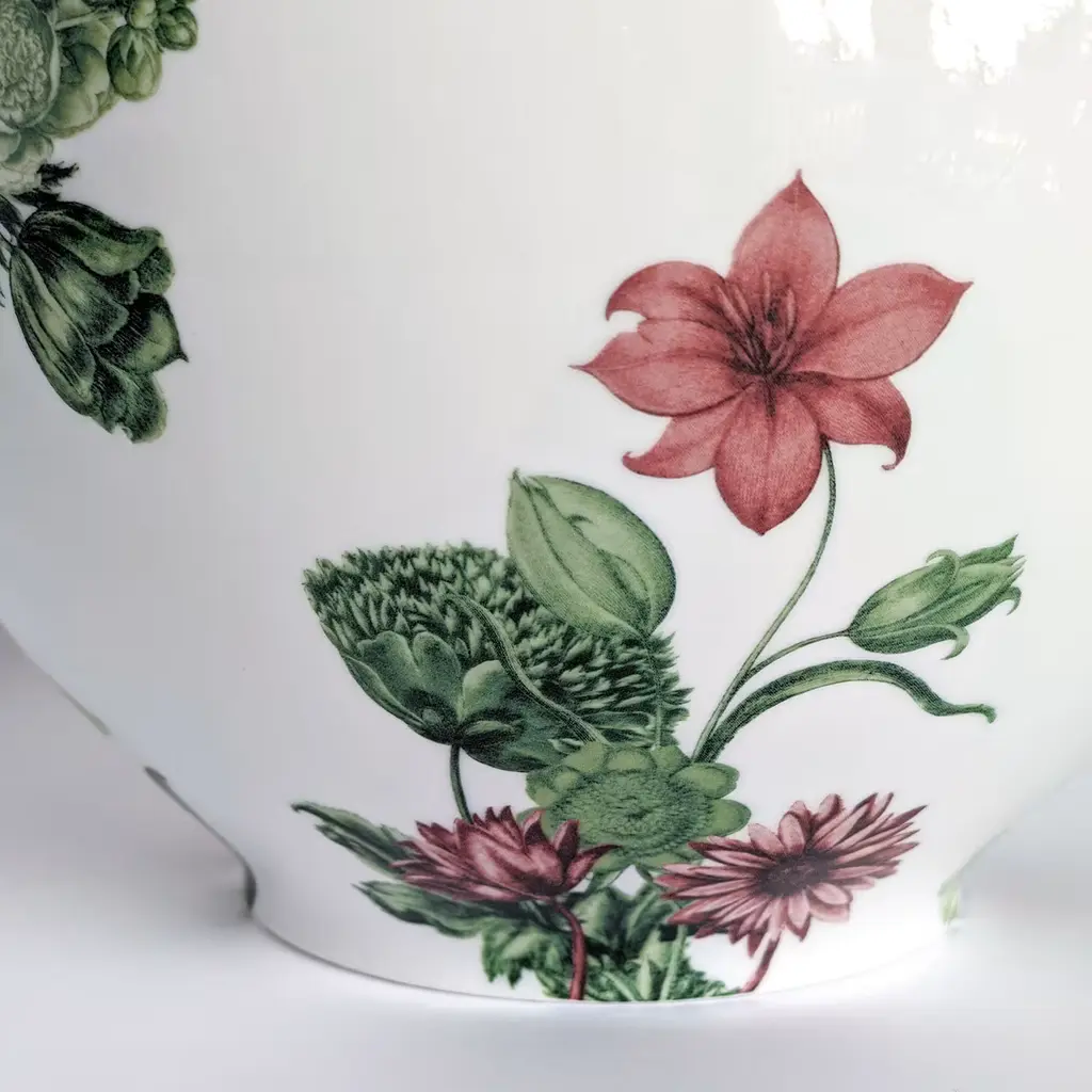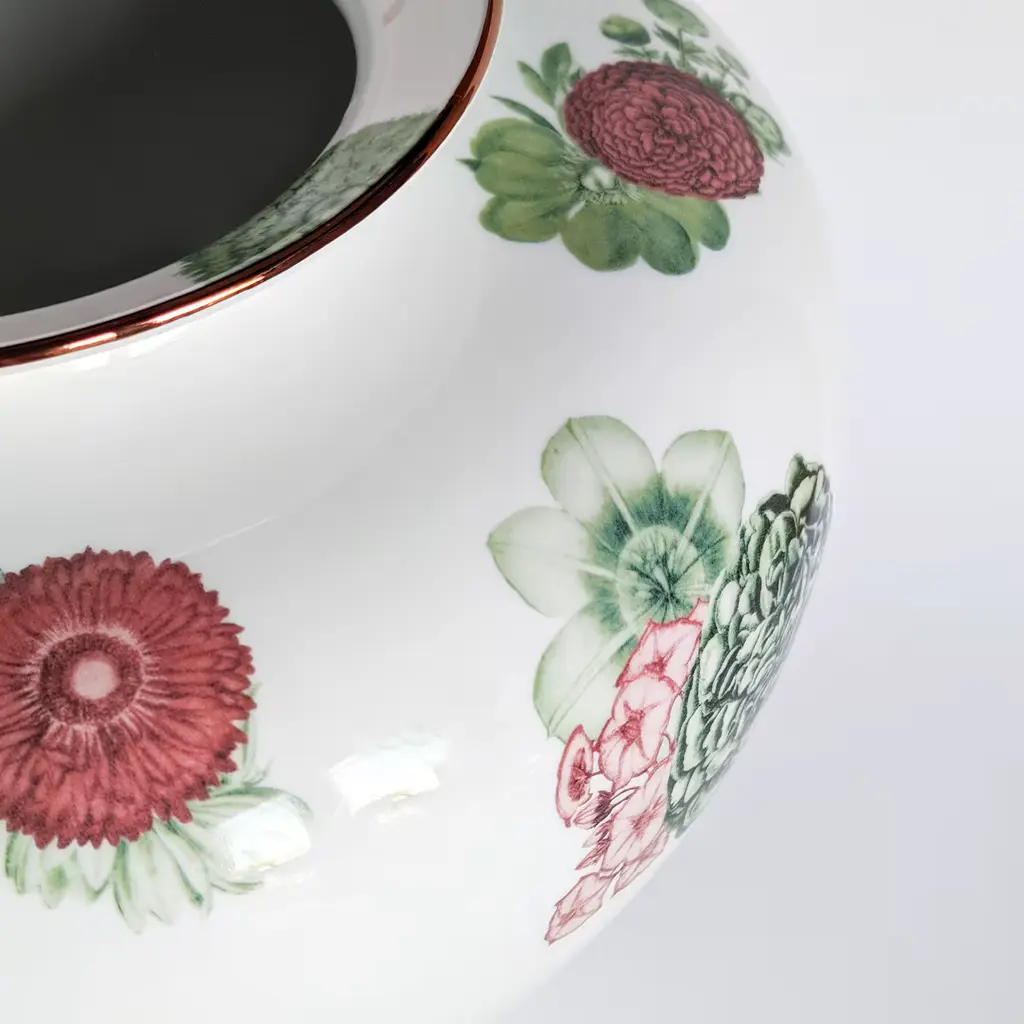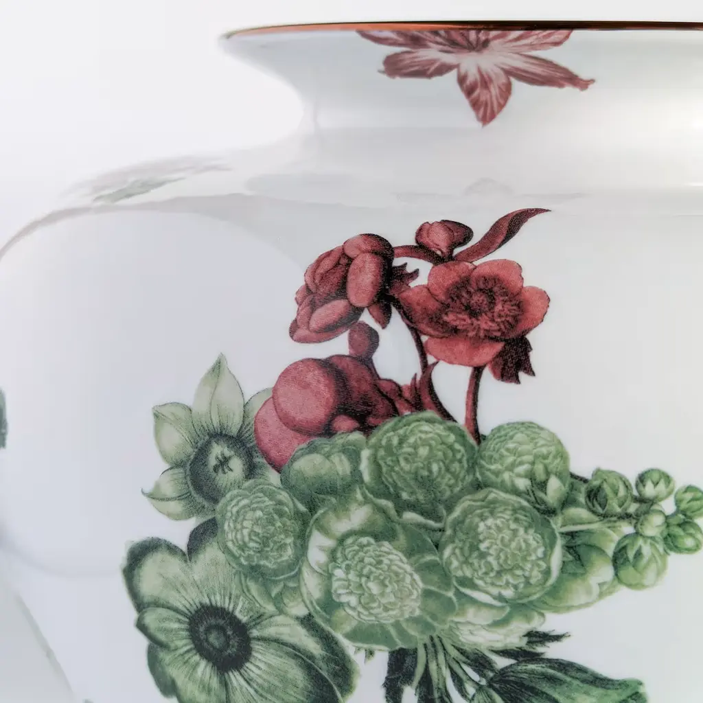 This delightful porcelain vase is sure to accent any decor with its romantic appeal, achieved by combining a classic and sinuous silhouette in fine porcelain with a feminine floral pattern with leaves and blossoming buds painted in pinkish-red and vibrant green. Ideal for hosting elegant flower arrangements, it will make for a superb addition to side tables, desks, or consoles.