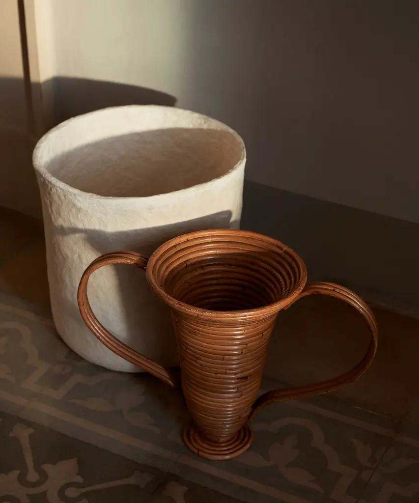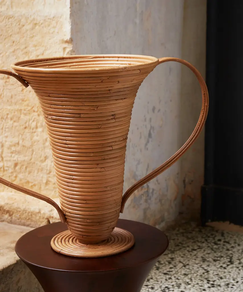 Featuring artfully over-dimensioned handles, the Amphora Vase plays with proportions and texture to redefine the expression of a conventional vase. Inspired by the archetypal amphoras used in ancient Greece, this decorative piece is braided from natural rattan and will make a sculptural statement in any room of your home.Designed and produced by the Copenhagen-based studio Ferm Living.