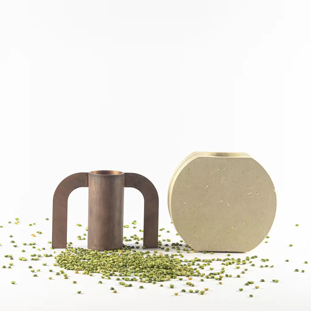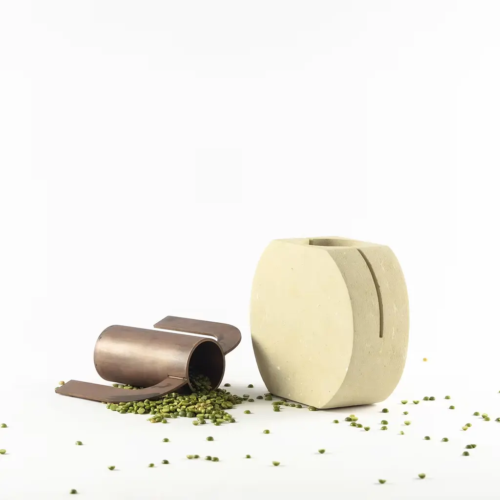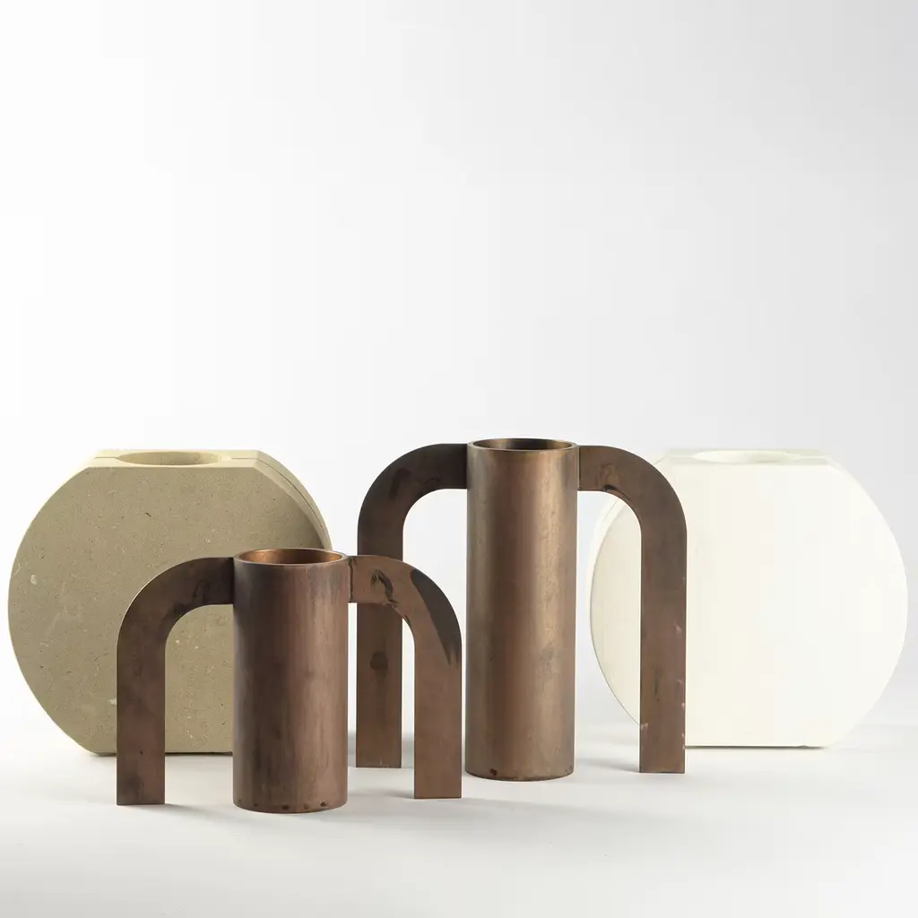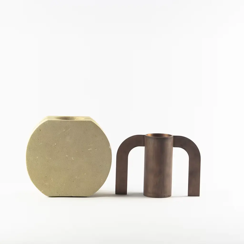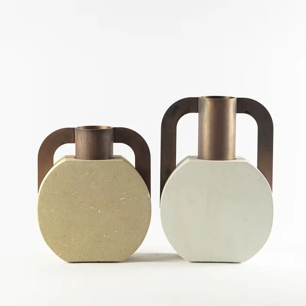 Providing exquisite character and depth, the iron component of this unique vase is etched and worked by hand. Recovered from a distant past and revisited in a contemporary way, this collection of vases in Leccese Stone and etched iron holds the theme of rediscovery. An encounter between stone and iron, a connection between past and present, material and form.