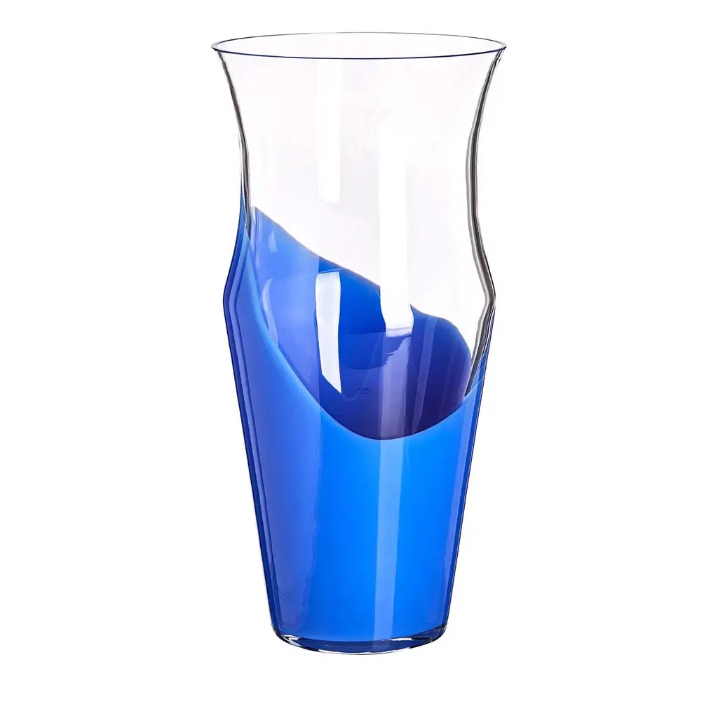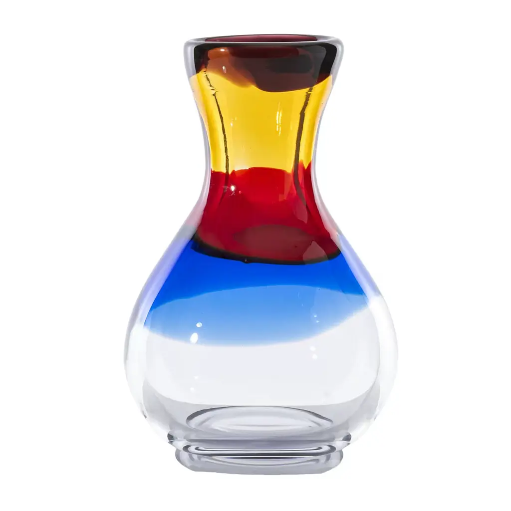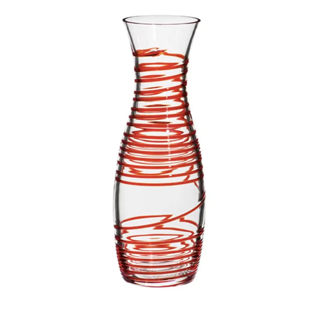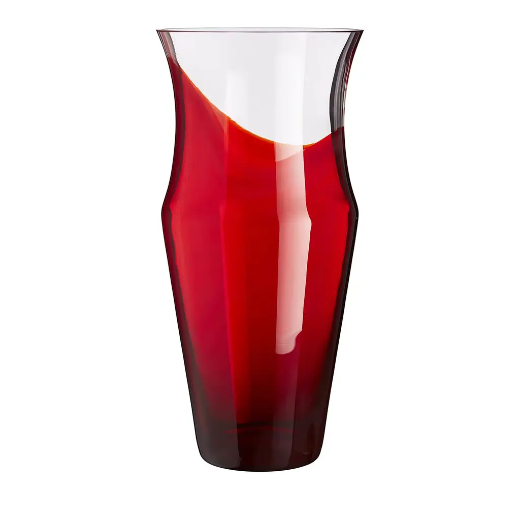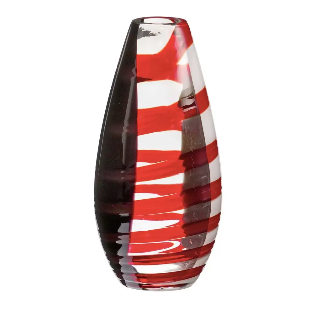 This stunning vase is part of the I Piccoli Collection, a series of small but precious objects that will enliven a refined interior alone or combined in a striking display. Part of a limited series of 333 items handcrafted of mouth-blown Murano crystal, each vase is entirely one-of-a-kind due to its artisanal production and carries the date and signature of the master glassmaker who made it. The crimson red decoration is applied by hand on the bottom and in vertical streaks on the top.