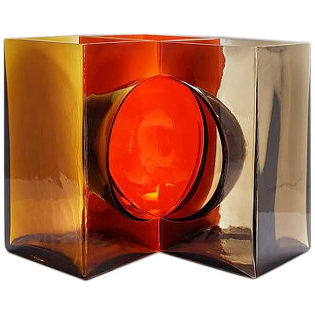 “The theme of this piece embodies the “Order of Space” by employing a simple geometry of a sphere subtracted from the centre of a cube. Perpendicular divisions of the combined volume result in four separate parts. Through the skilled craftsmanship of Venetian glassmakers, this design materializes into a jewel-like sculpture. This work takes the form of a group of three elements. The viewer must imagine the intentionally missing piece of the composition to complete the order of the “COSMOS”.” Tadao Ando