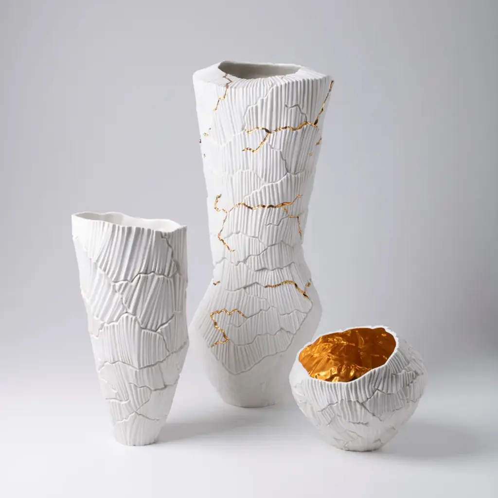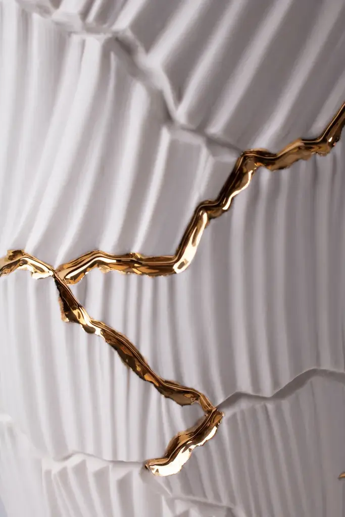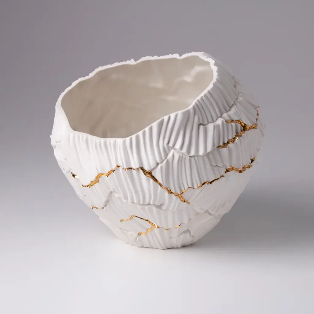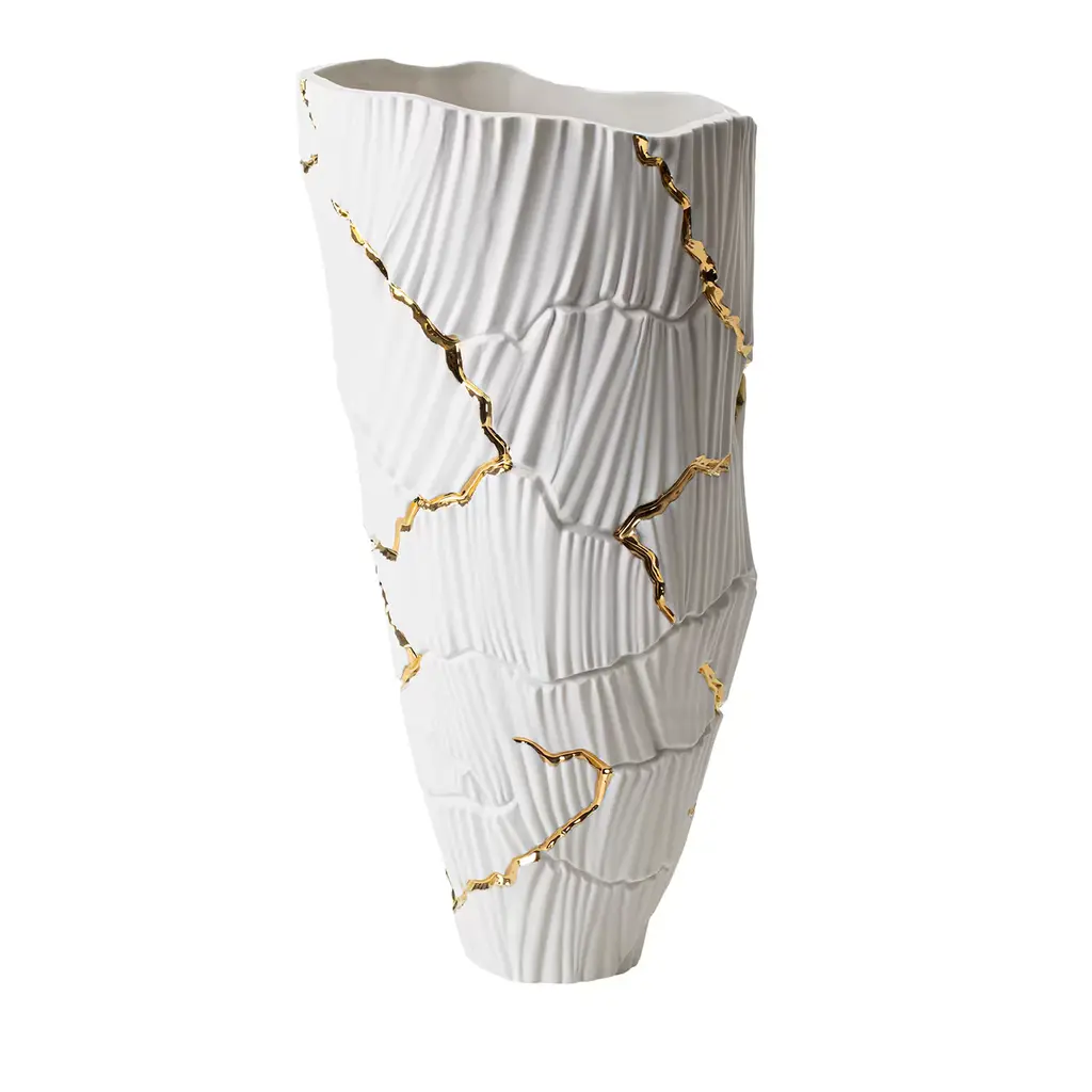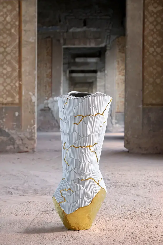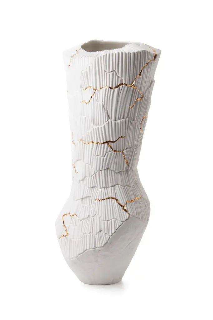 Anemos Gold is a vase made of porcelain. The soft curves of canals shaped by wind create a unique rhythm on the surface, interrupted by deep cracks, like a dry land which discloses a precious secret. The pure white of porcelain is emphasized by the alternation of light and shadows, rocks dug by the weather and crossed by liquid gold venations creating a sort of mineral kintsugi.