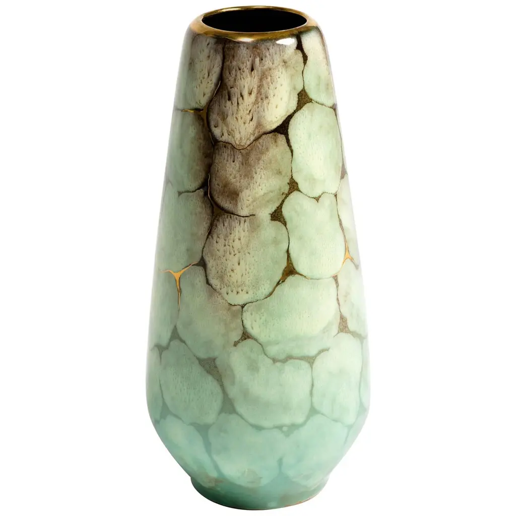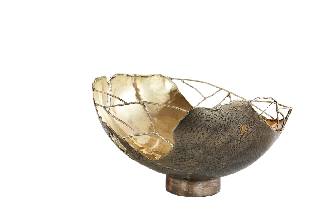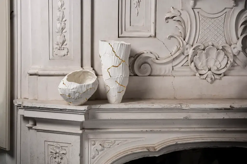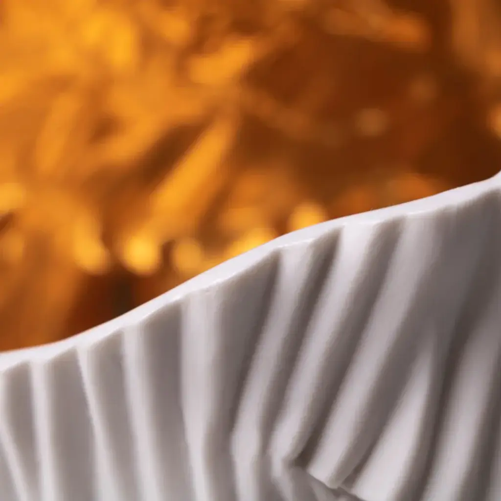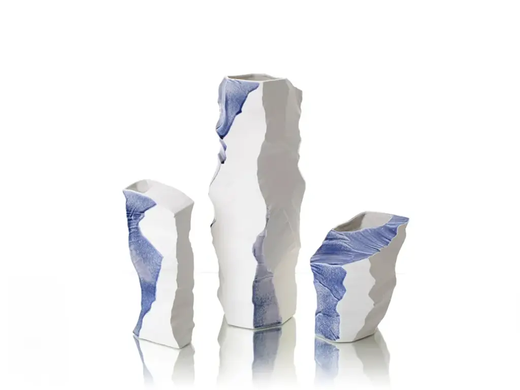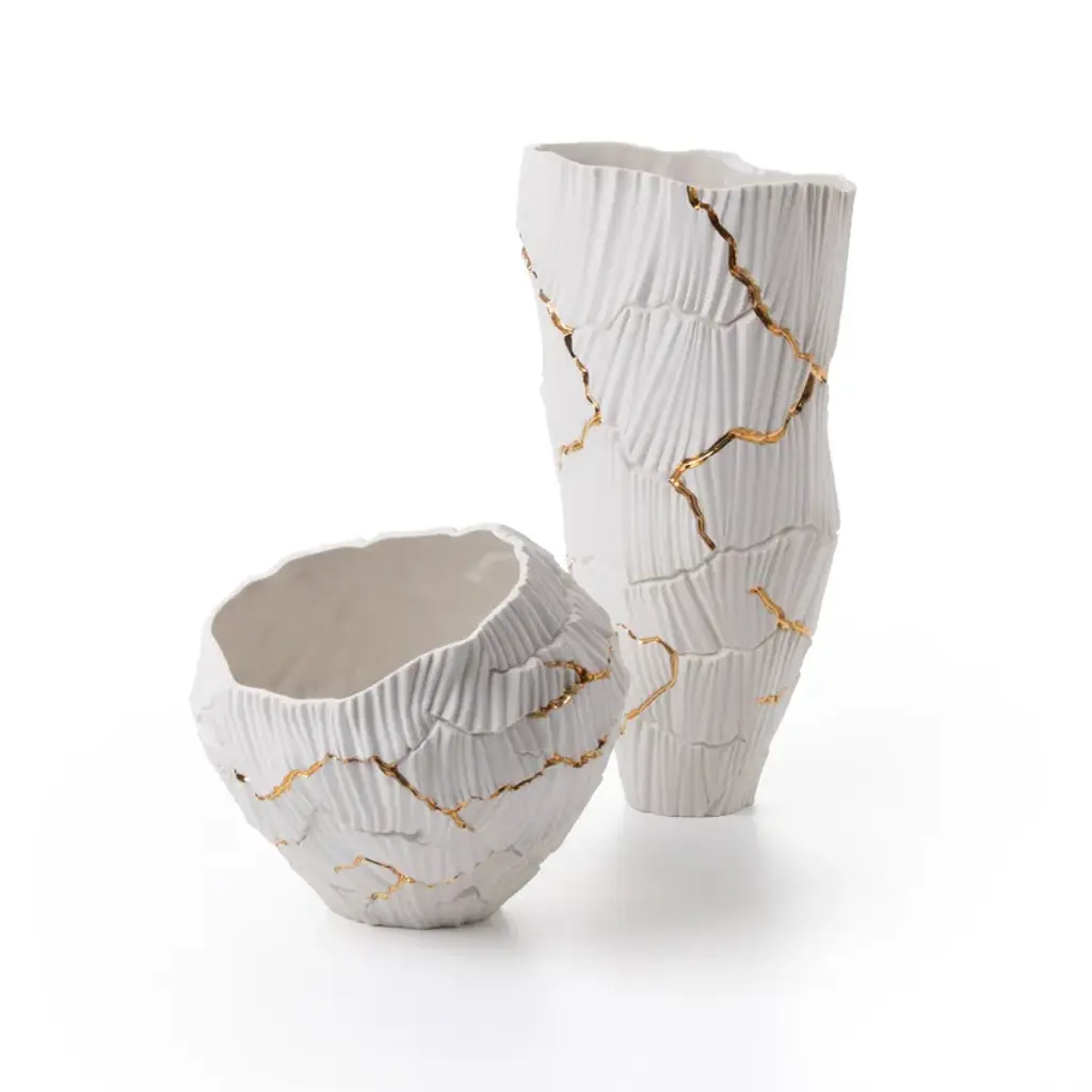 Anemos Gold is a vase made of porcelain. The soft curves of canals shaped by wind create a unique rhythm on the surface, interrupted by deep cracks, like a dry land which discloses a precious secret. The pure white of porcelain is emphasized by the alternation of light and shadows, rocks dug by the weather and crossed by liquid gold venations creating a sort of mineral kintsugi.